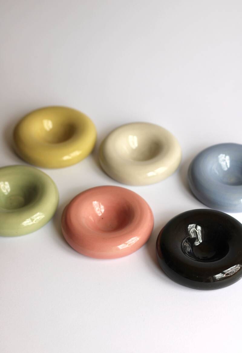handgedraaide steengoed eierdopjes. gemaakt van witte klei. in verschillende kleuren afgewerkt. met daar overheen transparant, glanzend glazuur.