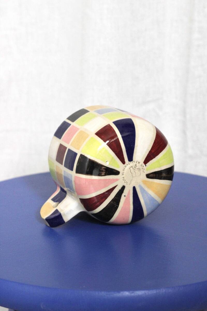 handgedraaid steengoed mokje. gemaakt van witte klei. gedecoreerd met verschillende kleuren onderglazuur in blokjespatroon. afgewerkt met glanzend transparant glazuur aan binnen- en buitenkant.