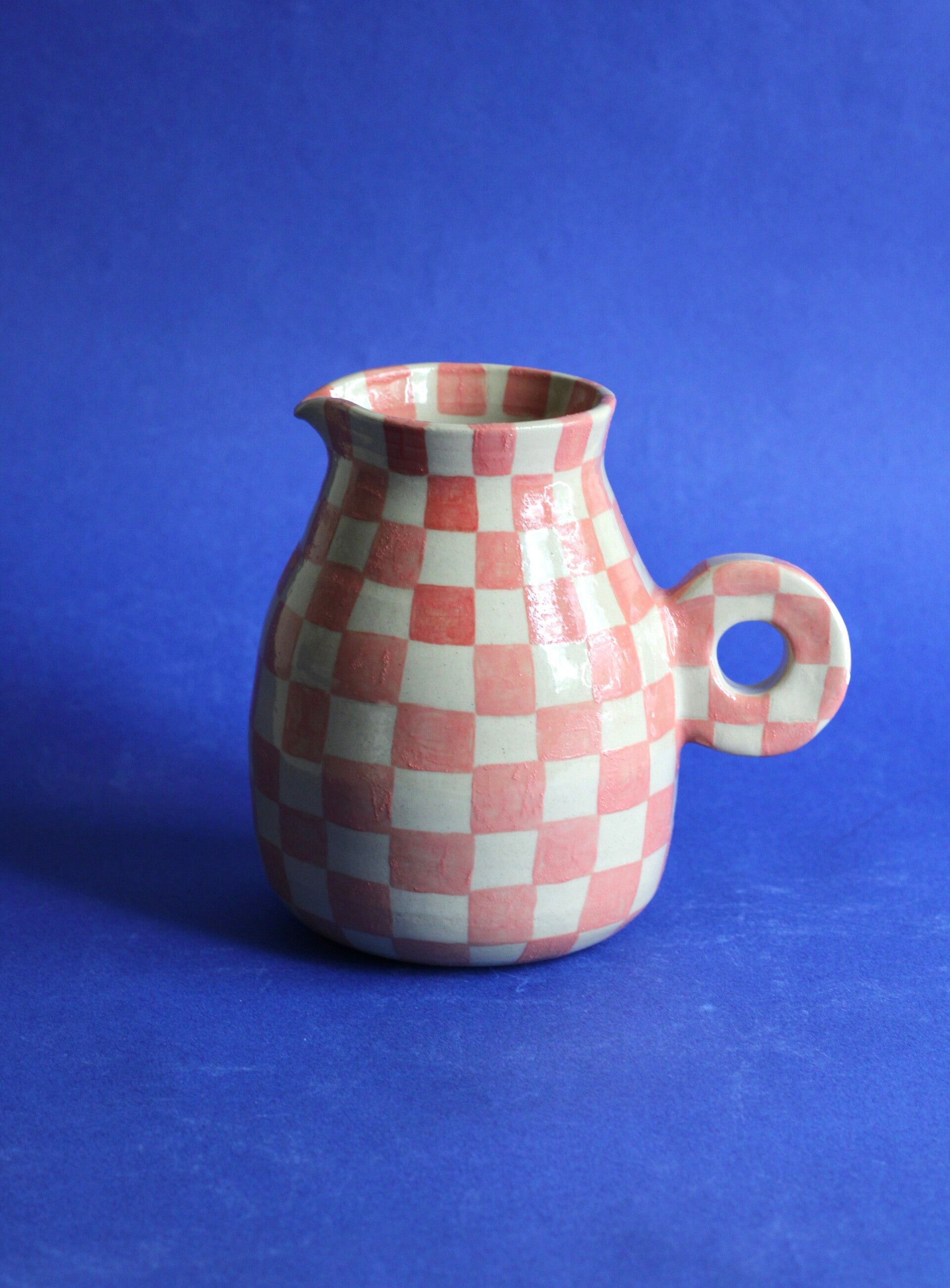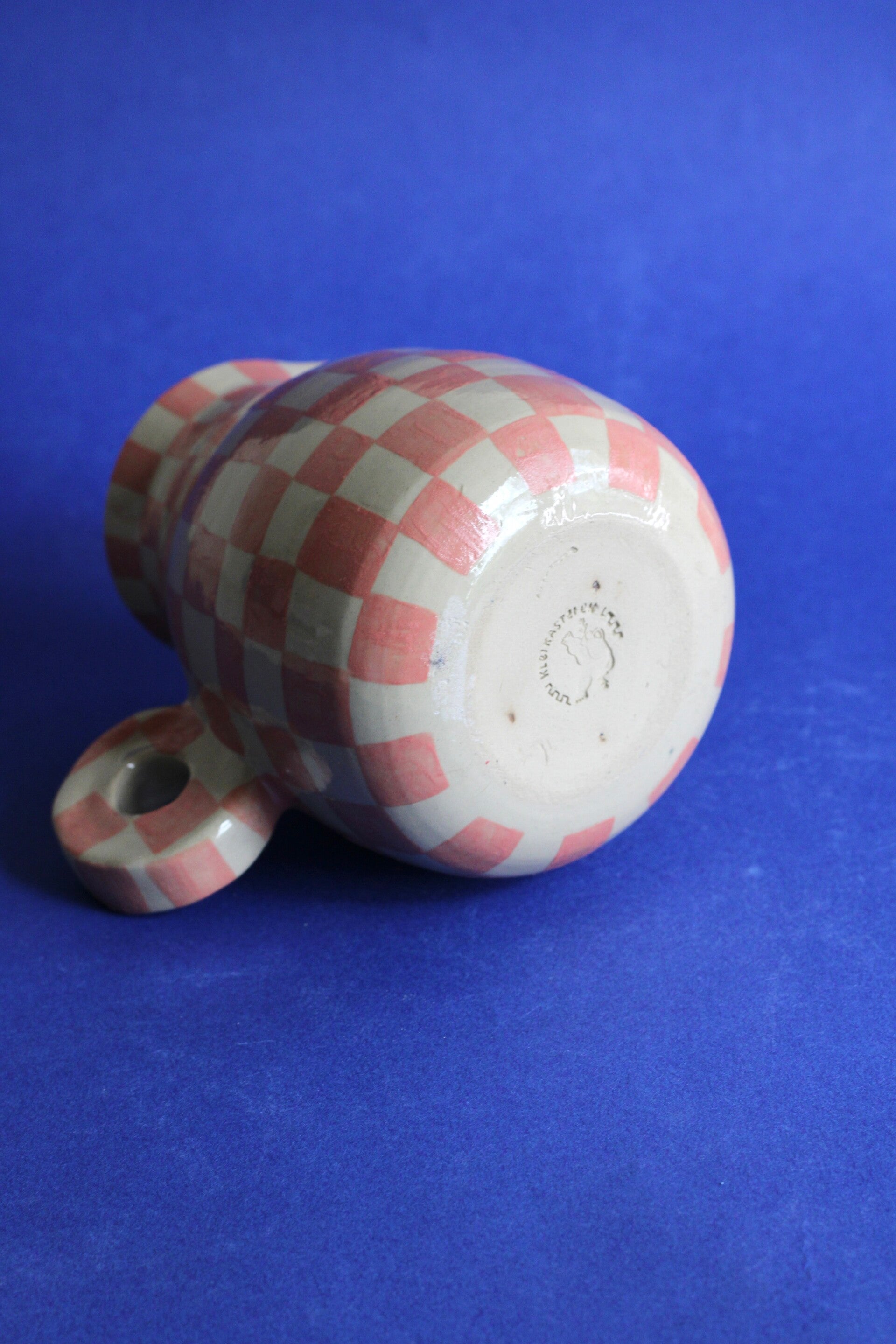 handgedraaide steengoed kan met schenktuit en rond oor. gedecoreerd met blokjes in een vrolijke, roze kleur. afgewerkt met transparant, glanzend glazuur aan binnen- en buitenkant.