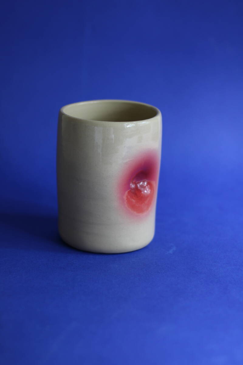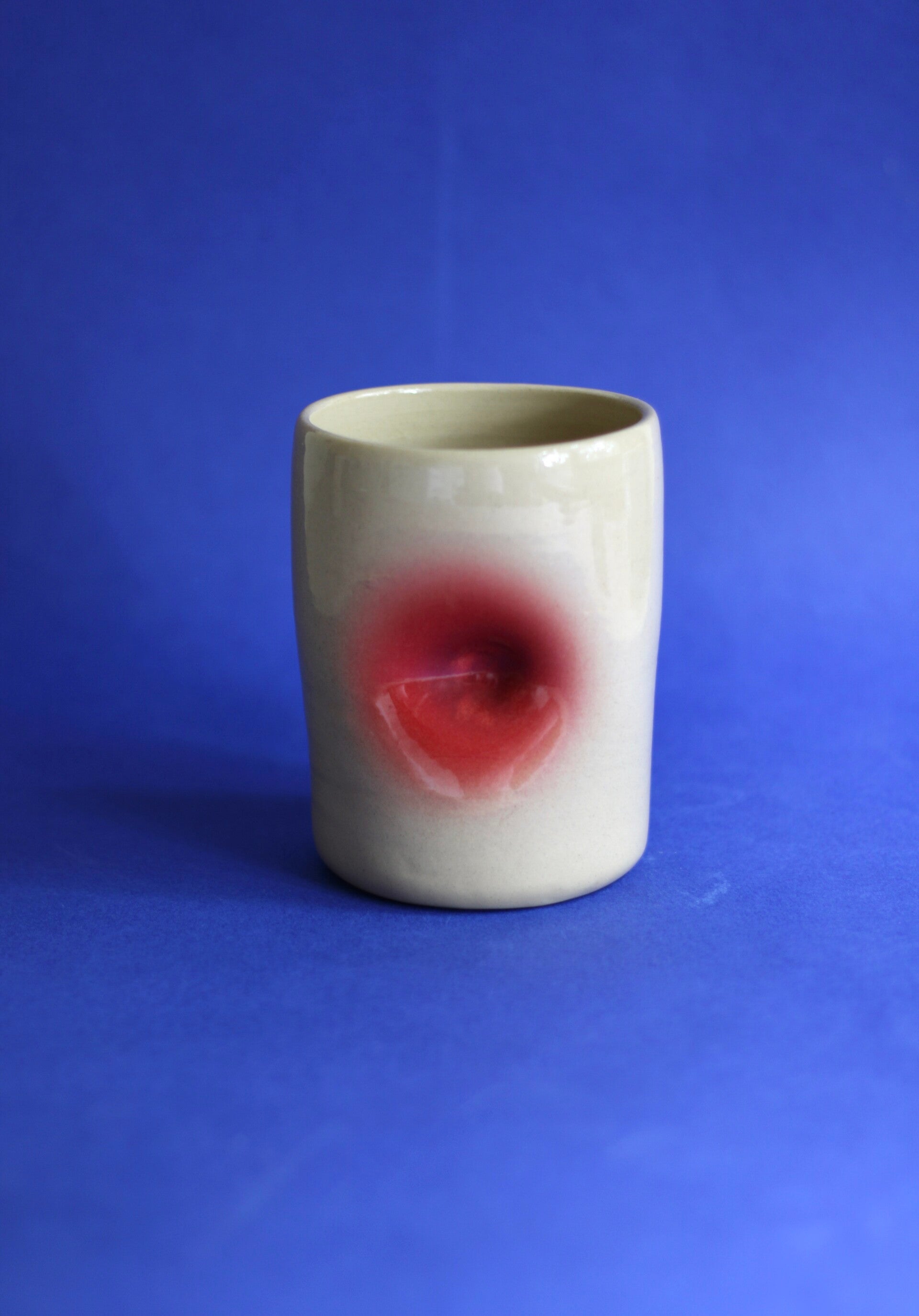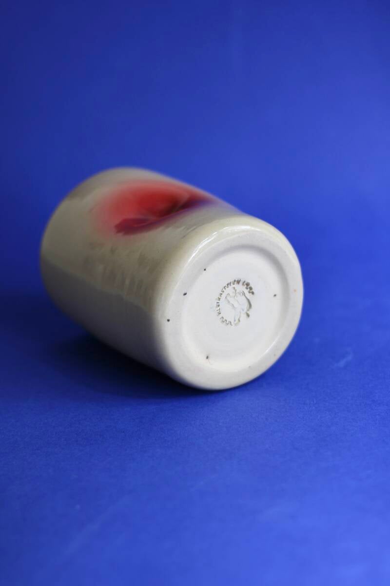 handgedraaid steengoed kop. gemaakt van witte klei. gedecoreerd met onderglazuur in een rode kleur. glanzend transparant glazuur aan binnen- en buitenkant. de kop heeft aan beide kanten een deuk waardoor hij heel prettig in de hand ligt!