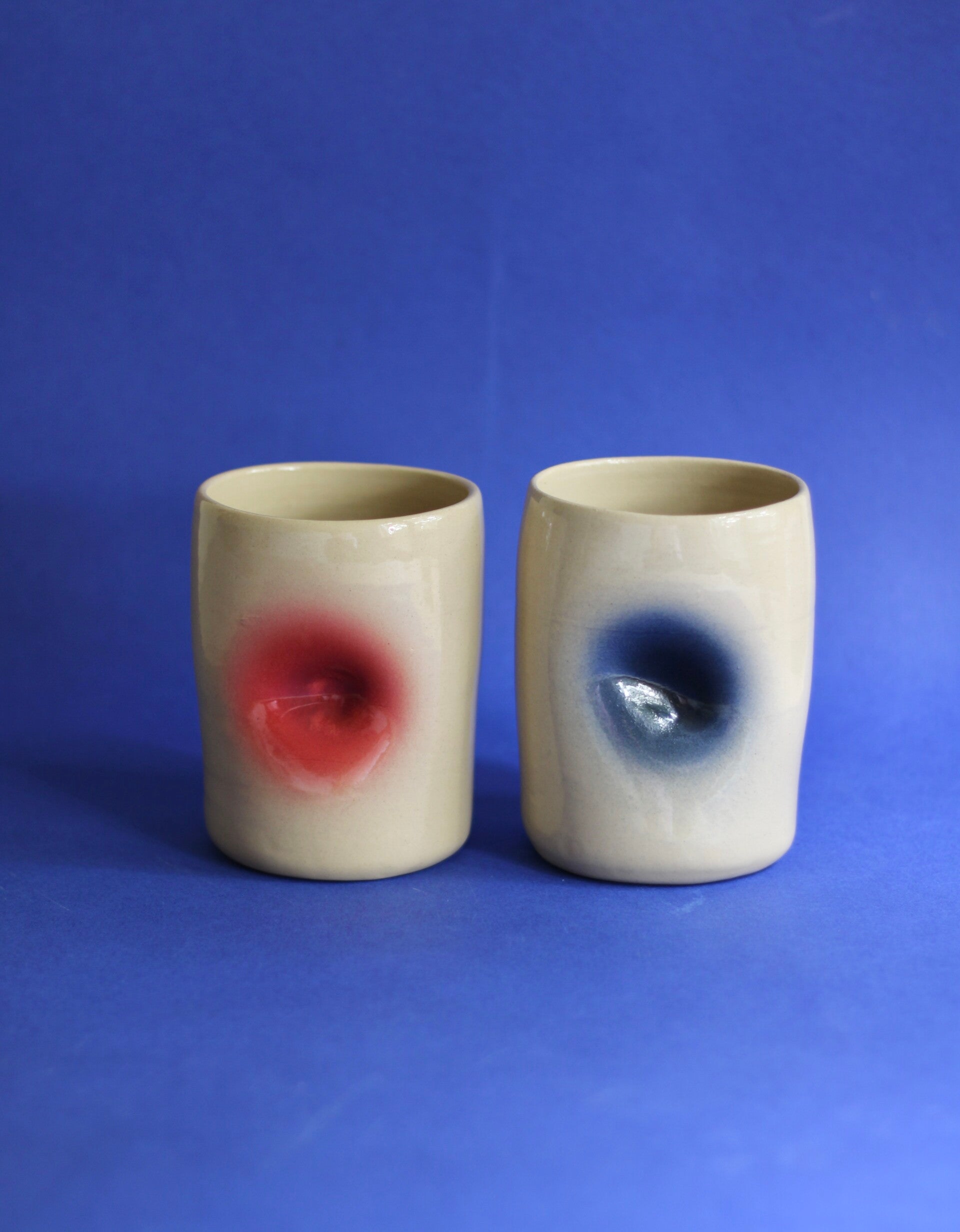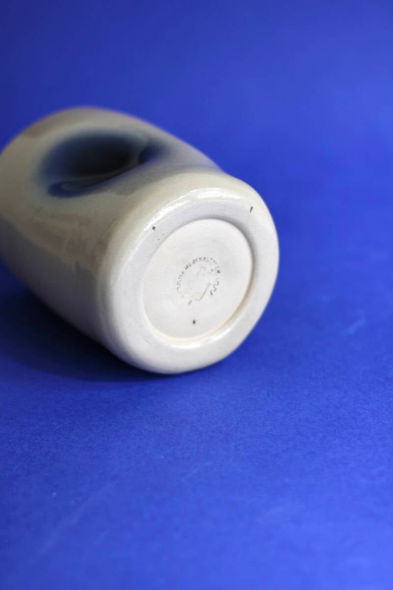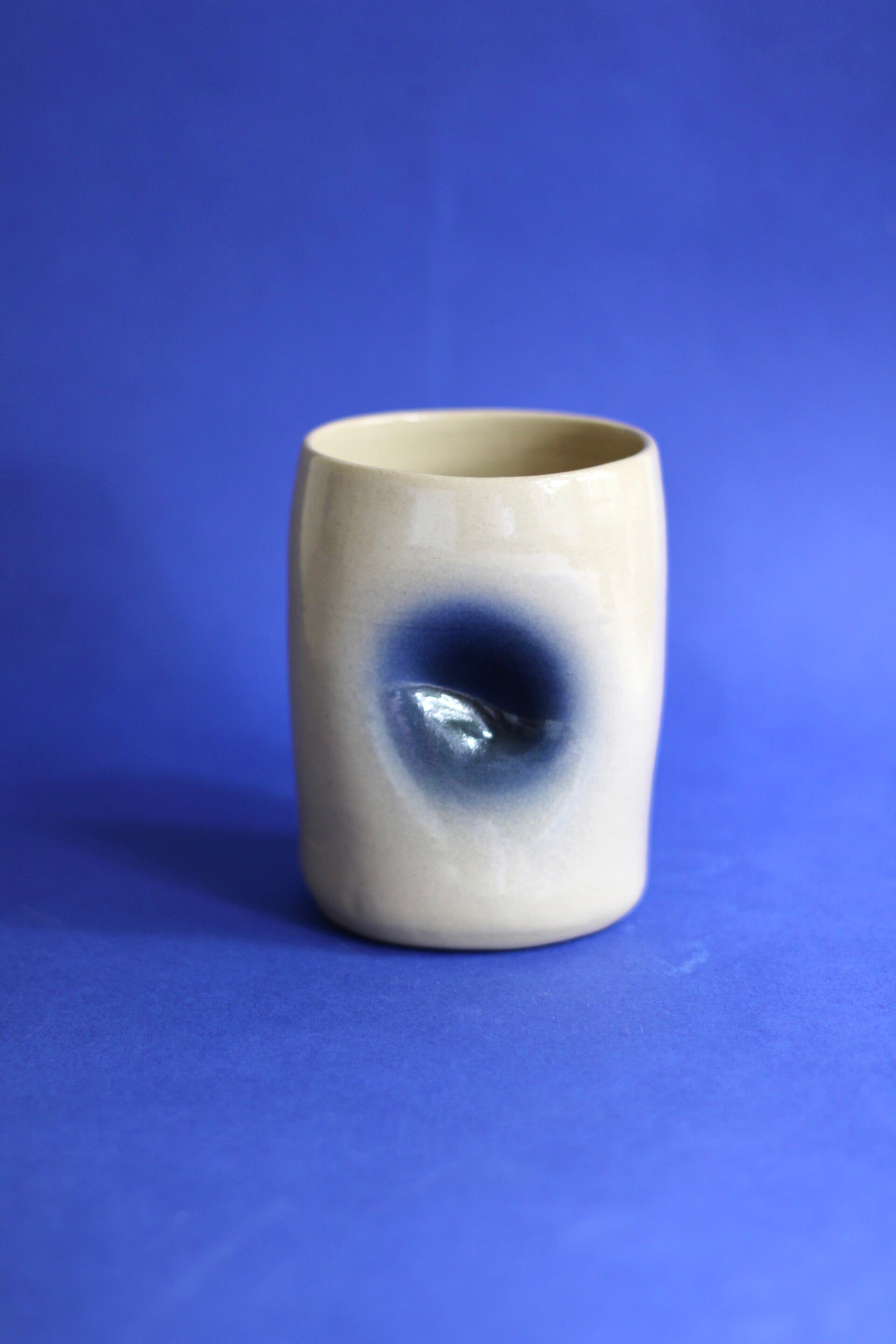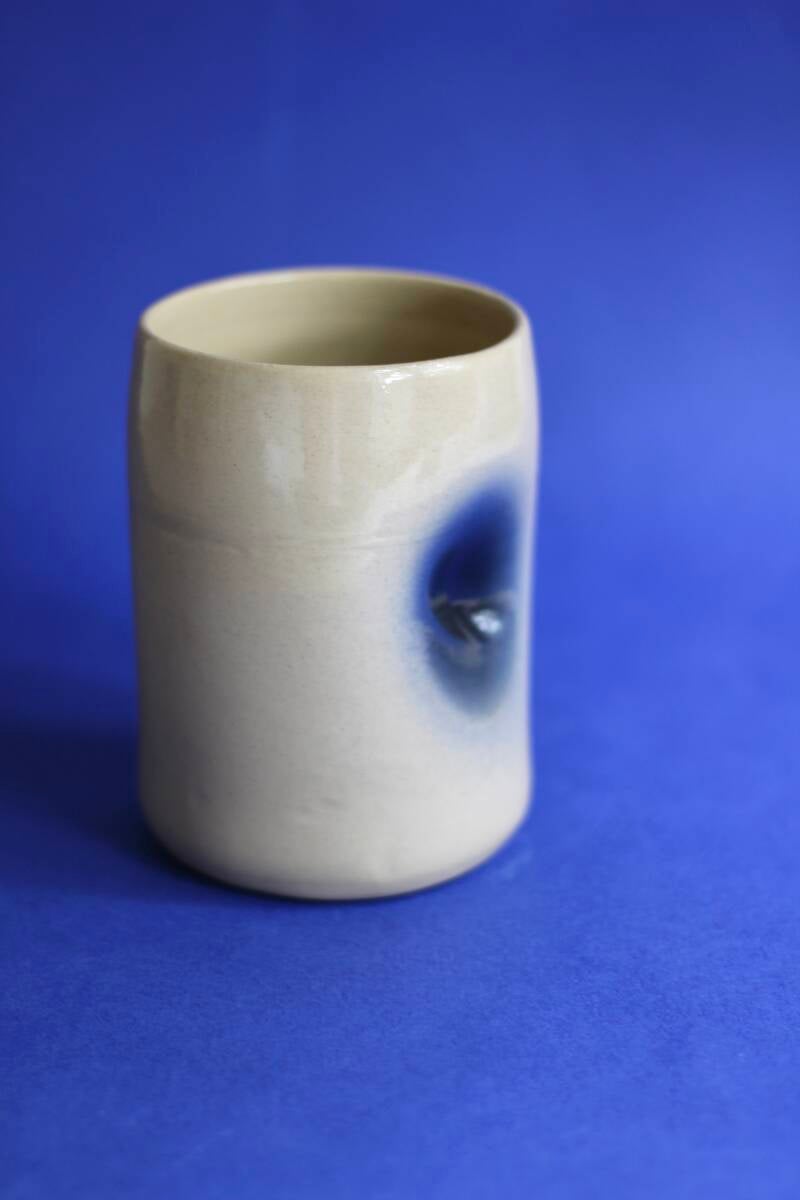 handgedraaid steengoed kop. gemaakt van witte klei. gedecoreerd met onderglazuur in een blauwe kleur. glanzend transparant glazuur aan binnen- en buitenkant. de kop heeft aan beide kanten een deuk waardoor hij heel prettig in de hand ligt!