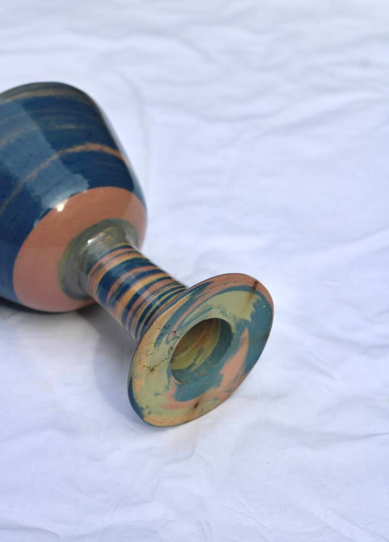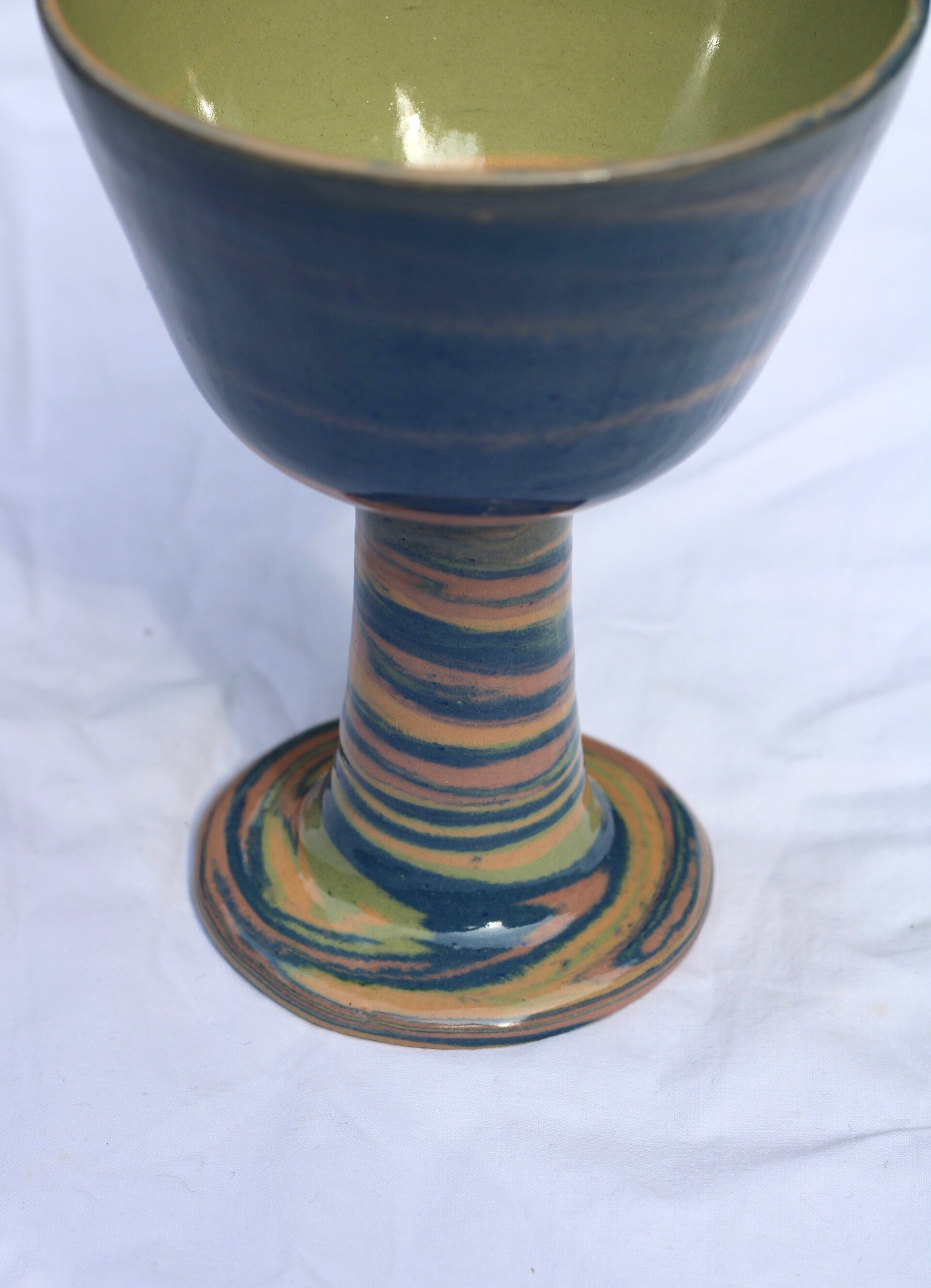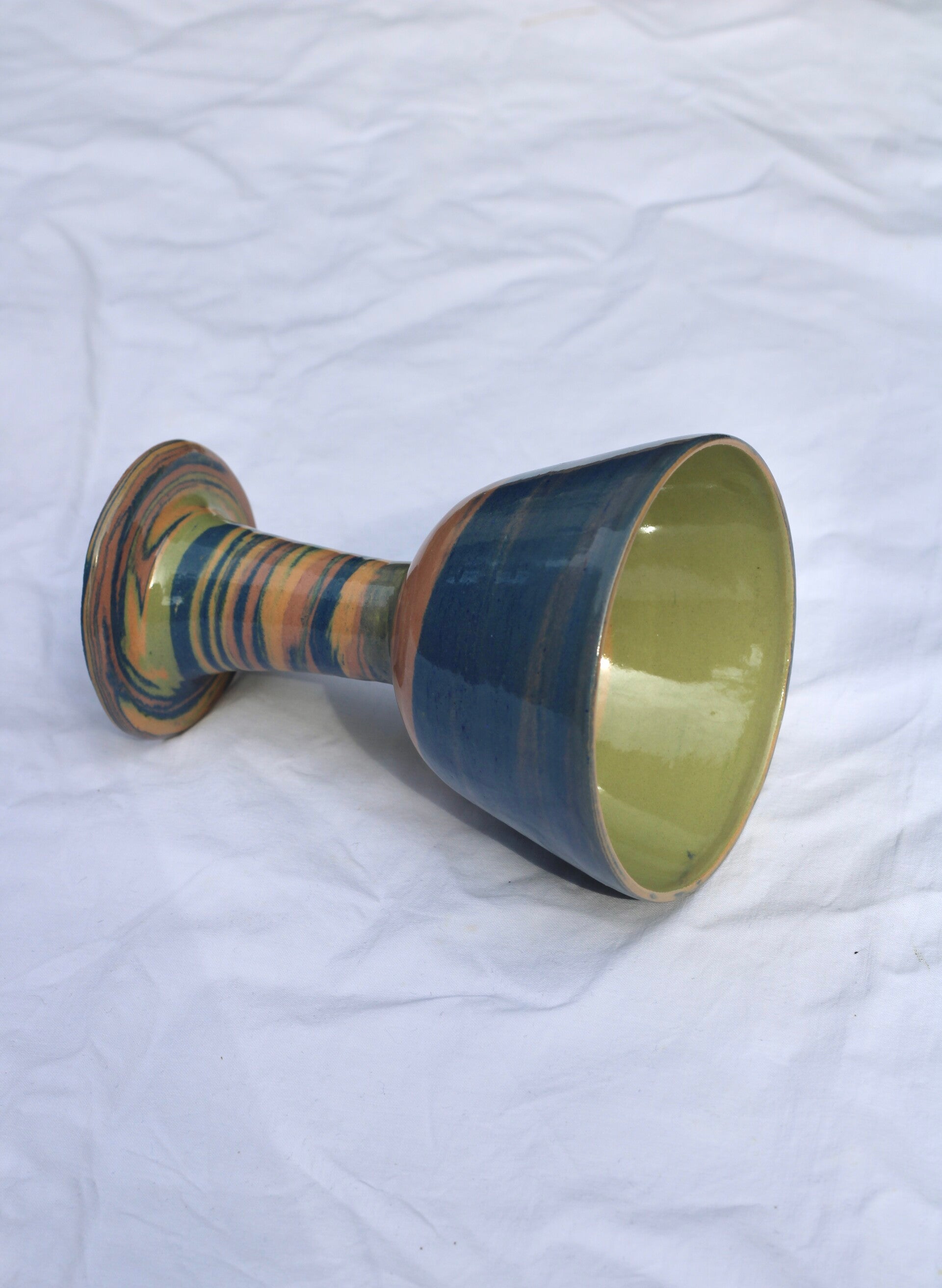 handgedraaid steengoed wijnglas. gemaakt van groene, blauwe, oranje en roze klei. afgewerkt met glanzend glazuur aan binnen- en buitenkant.