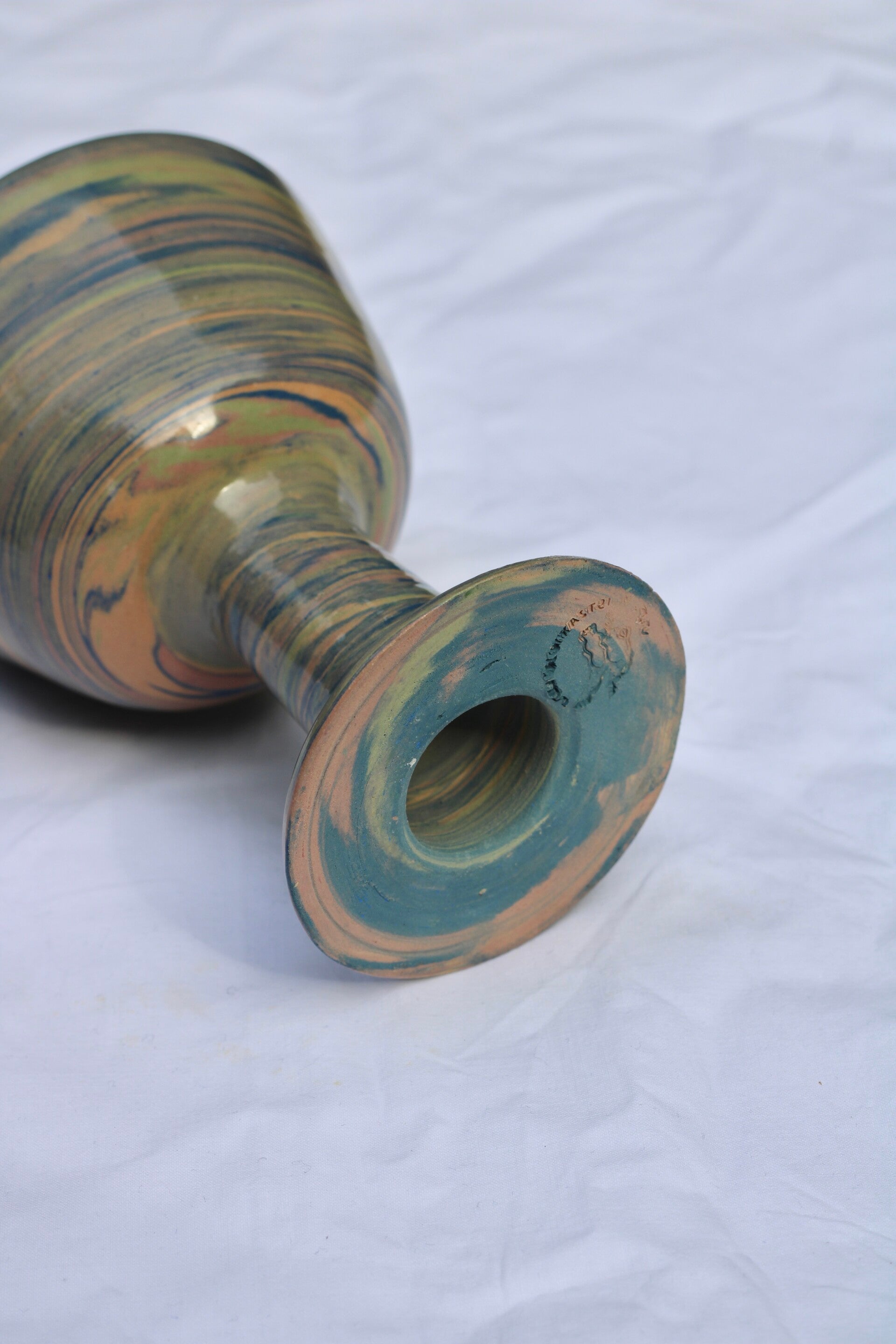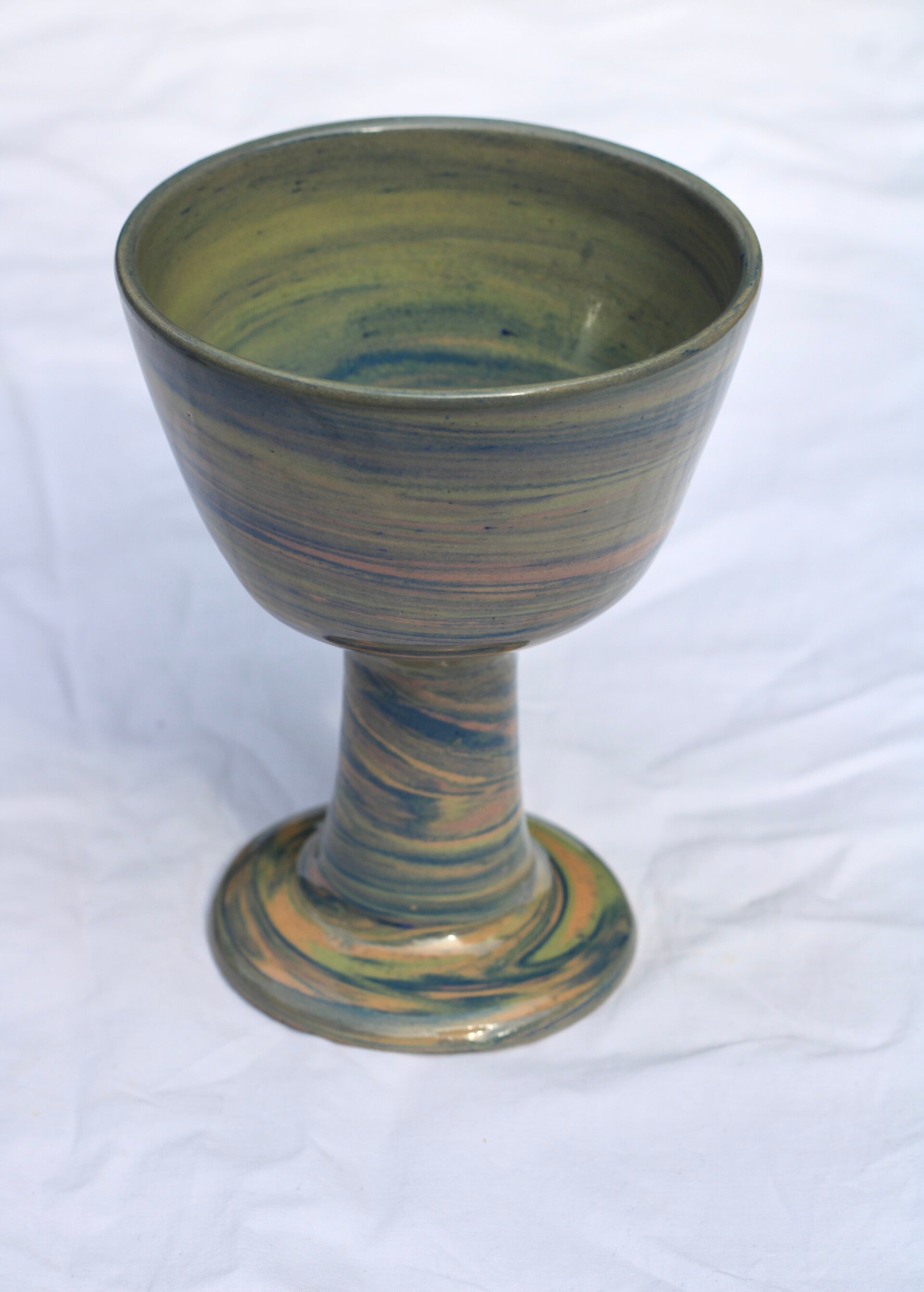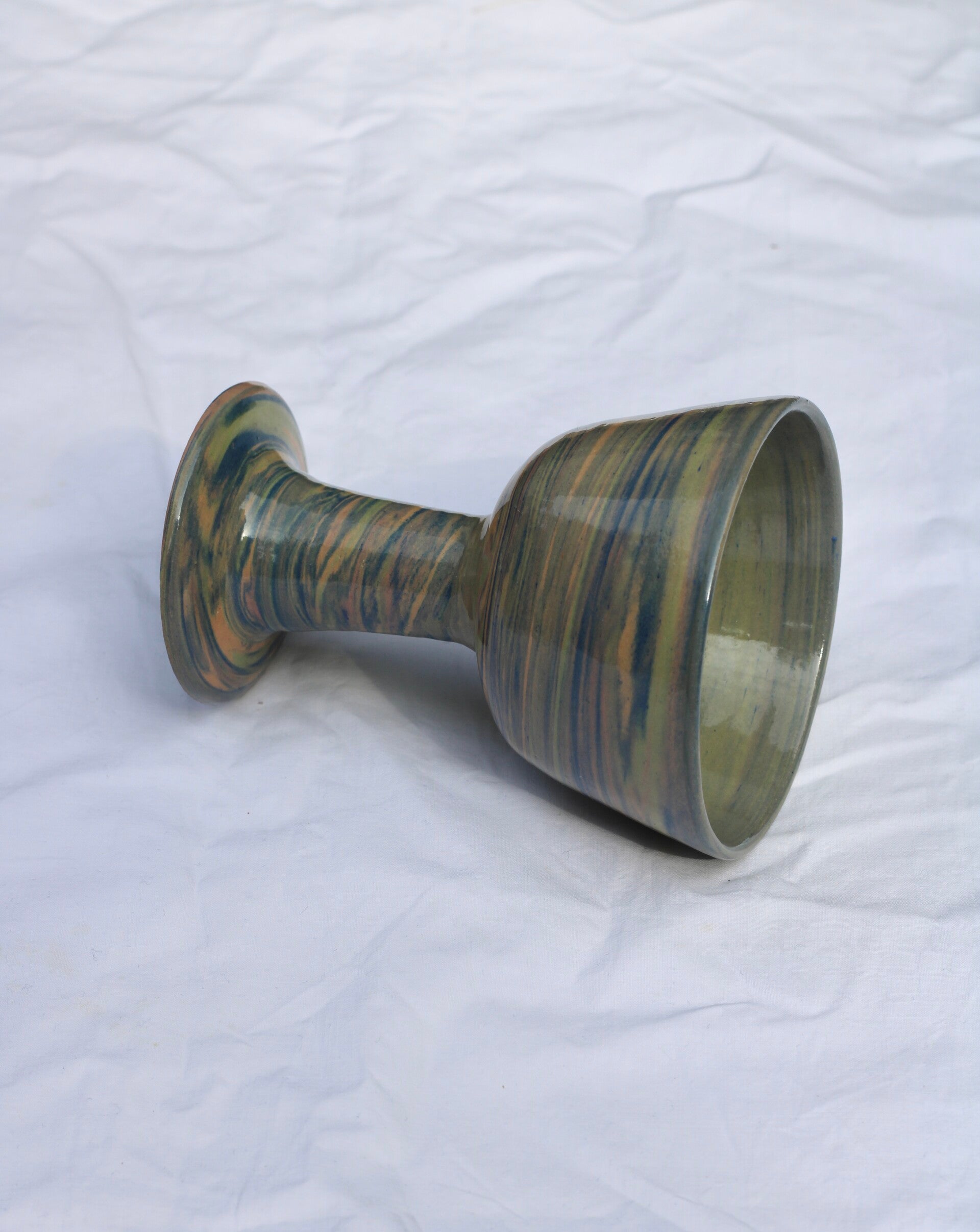 handgedraaid steengoed wijnglas. gemaakt van groene, blauwe, oranje en roze klei. afgewerkt met glanzend glazuur aan binnen- en buitenkant.