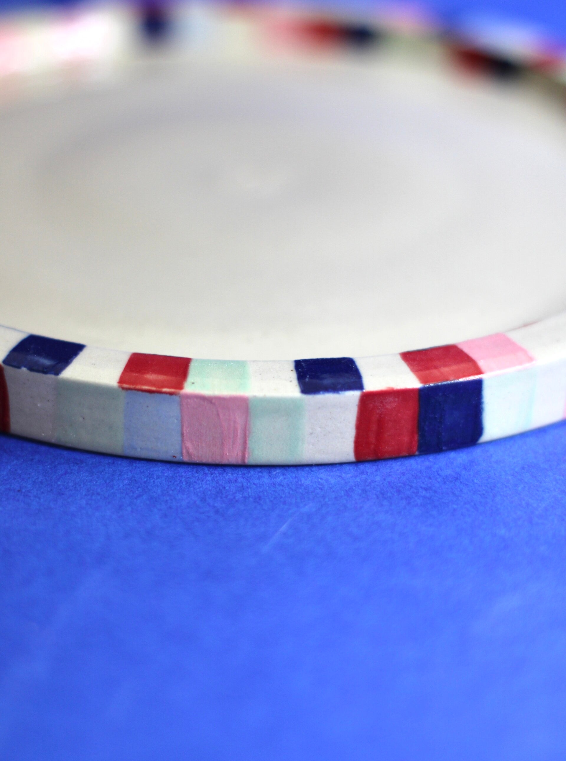 handgedraaid steengoed bordje. gemaakt van witte klei. gedecoreerd met gekleurde onderglazuurblokjes. afgewerkt met glanzend glazuur aan binnen- en buitenkant.
