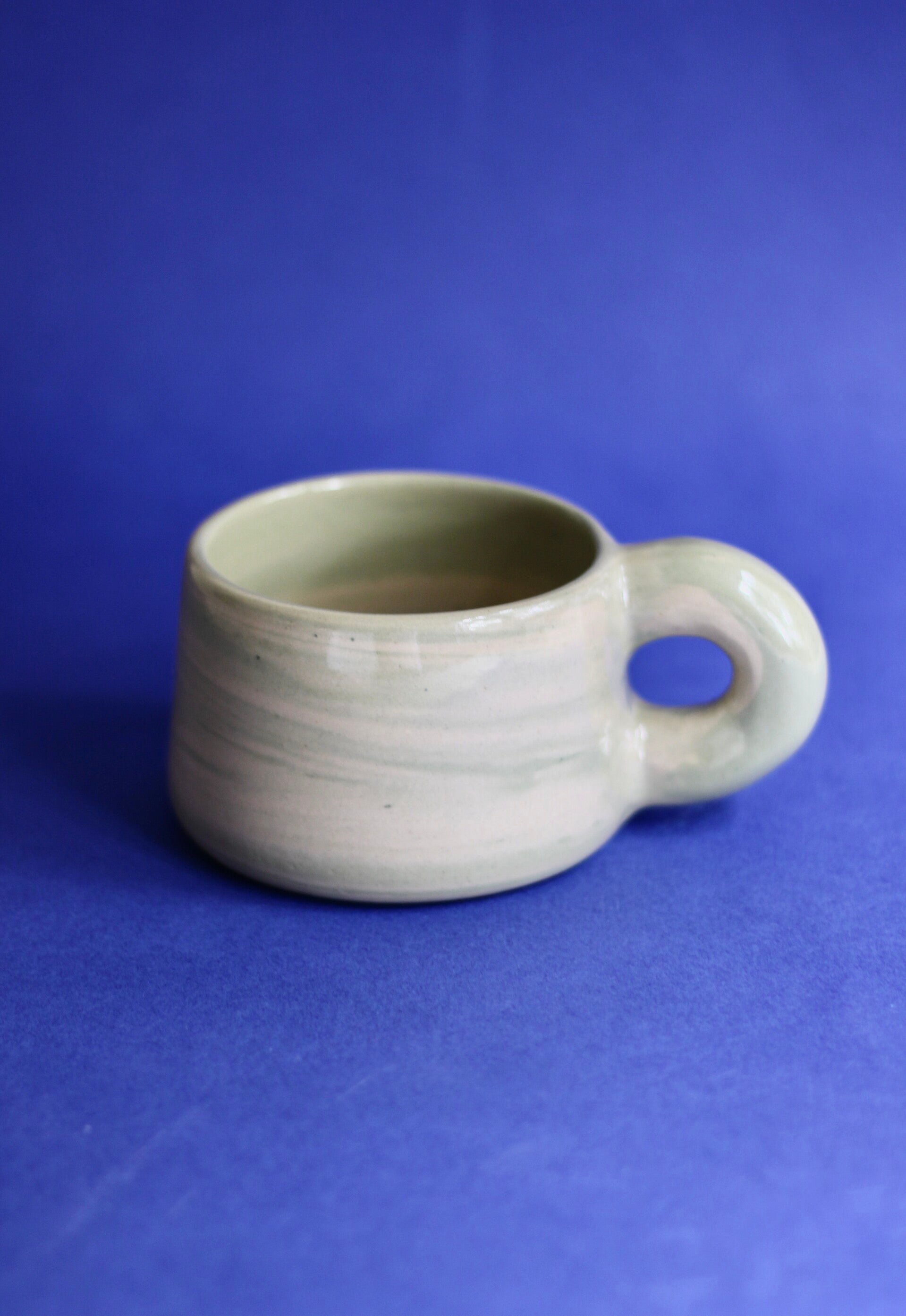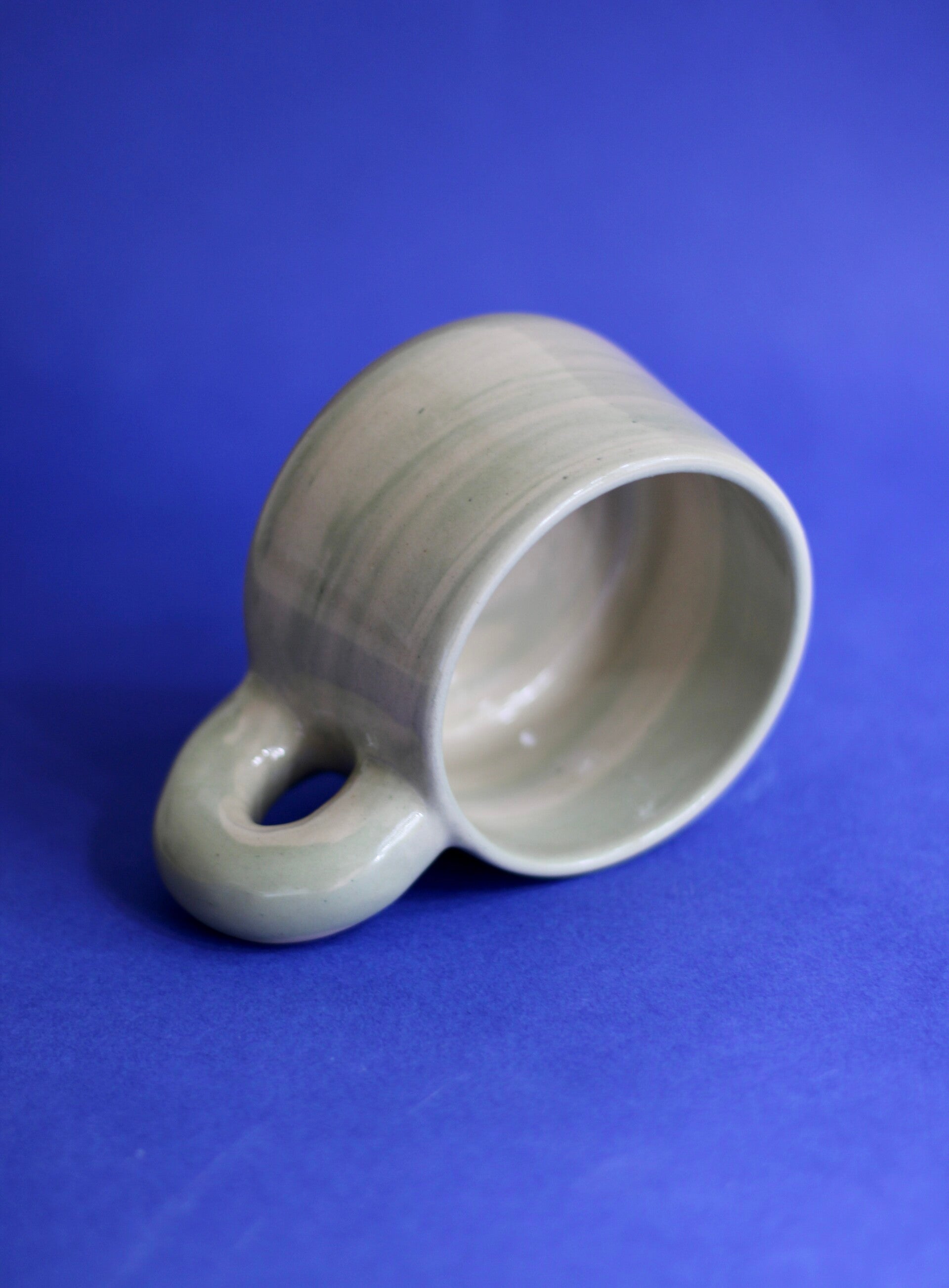 handgedraaide steengoed mok. gemaakt van witte en groene klei. afgewerkt met glanzend glazuur aan binnen- en buitenkant.