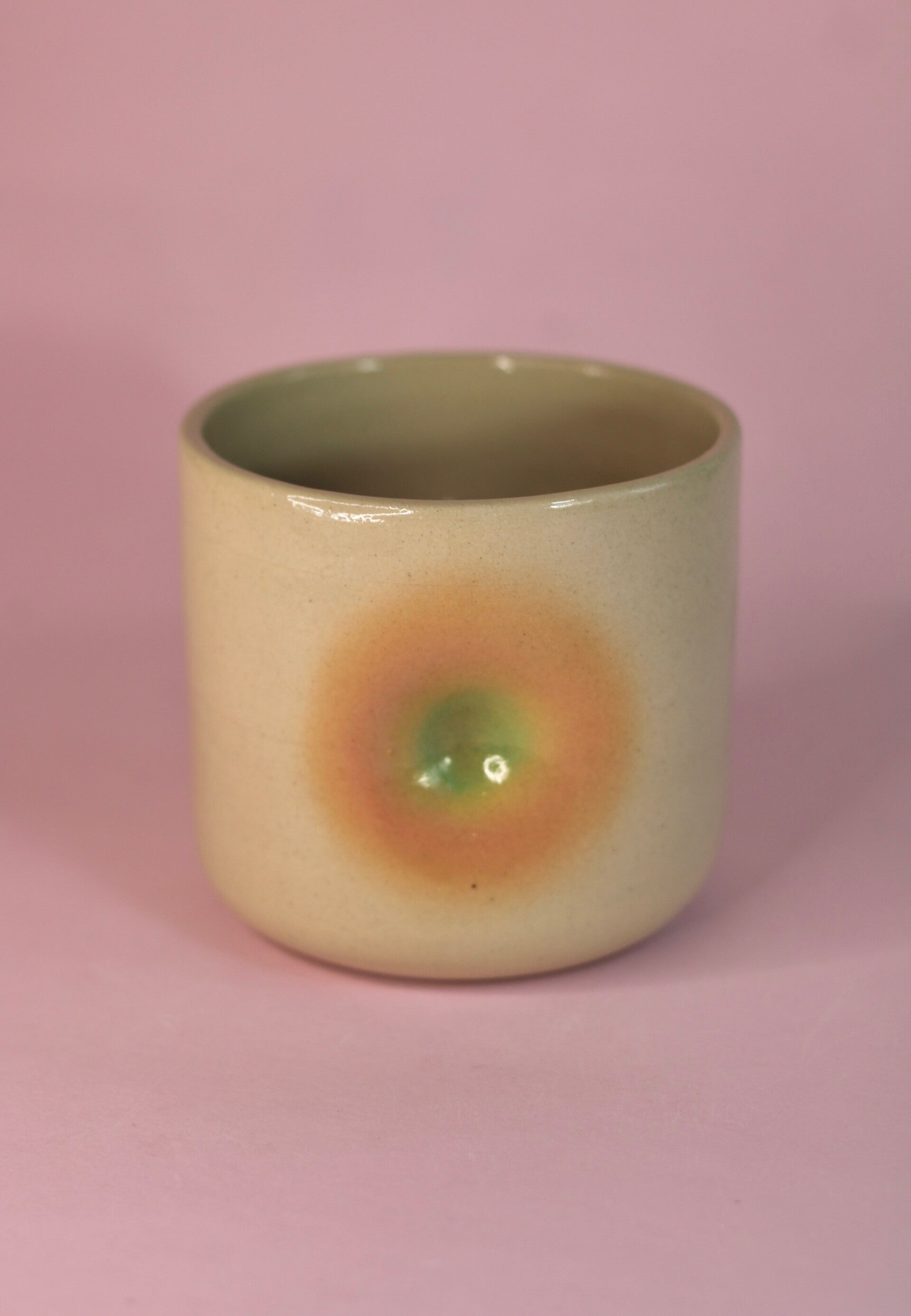 handgedraaid steengoed kopje met ingedeukte zijkanten. gemaakt van witte klei. gedecoreerd met geairbrushed onderglazuur in perzik, roze, en groene tinten aan beide kanten van het kopje. glanzend transparant glazuur aan binnen- en buitenkant.