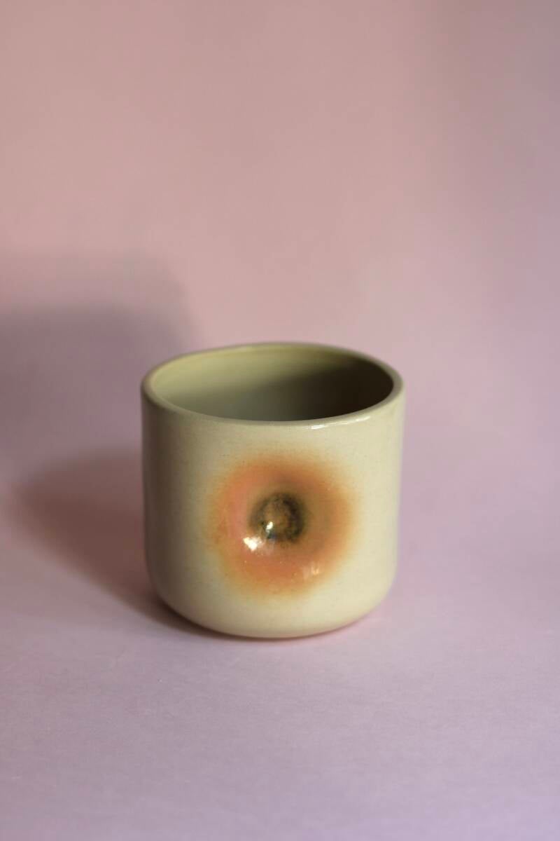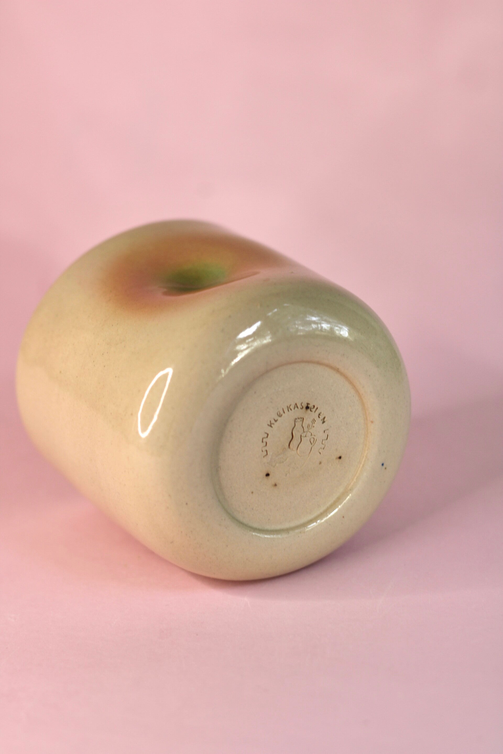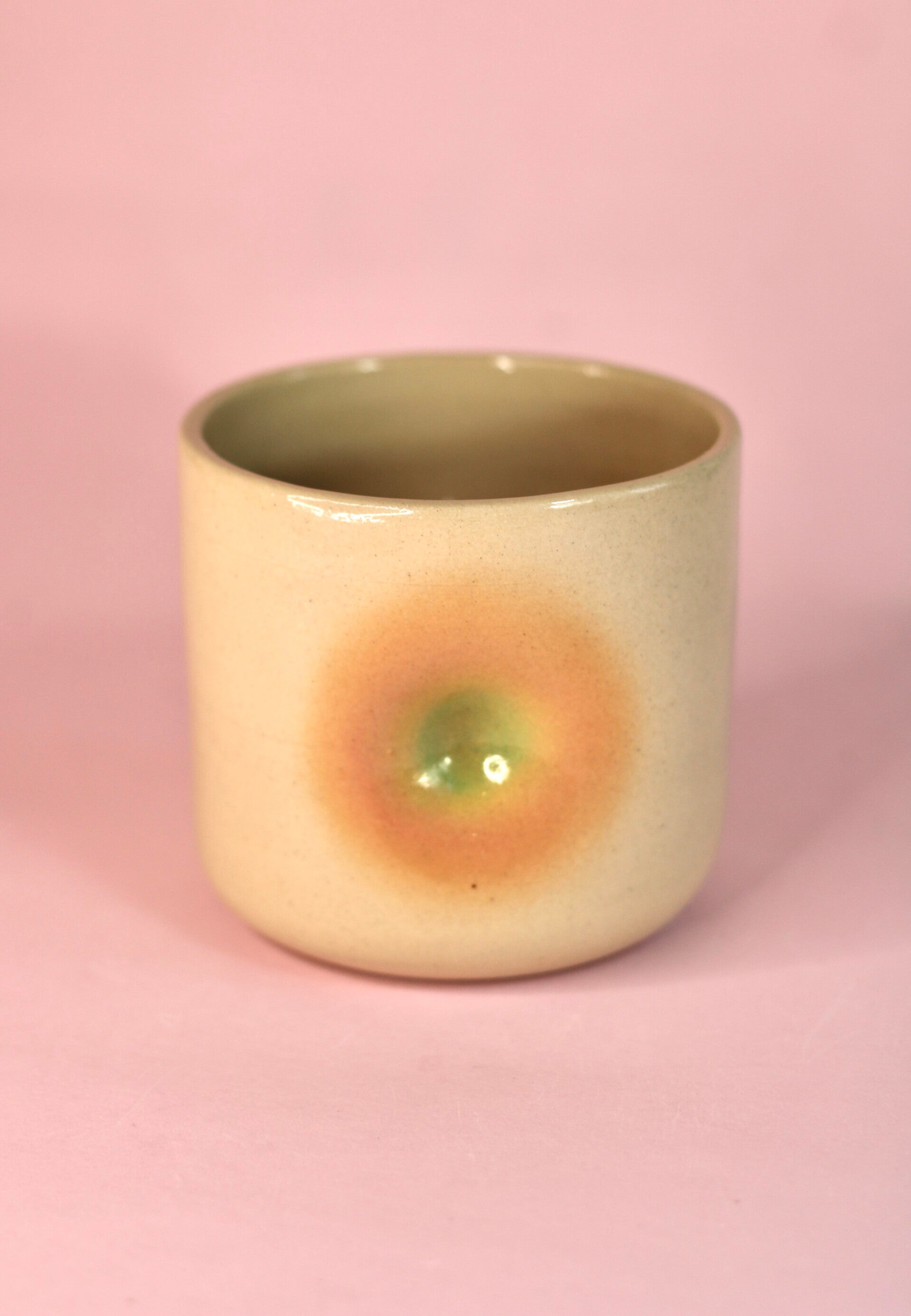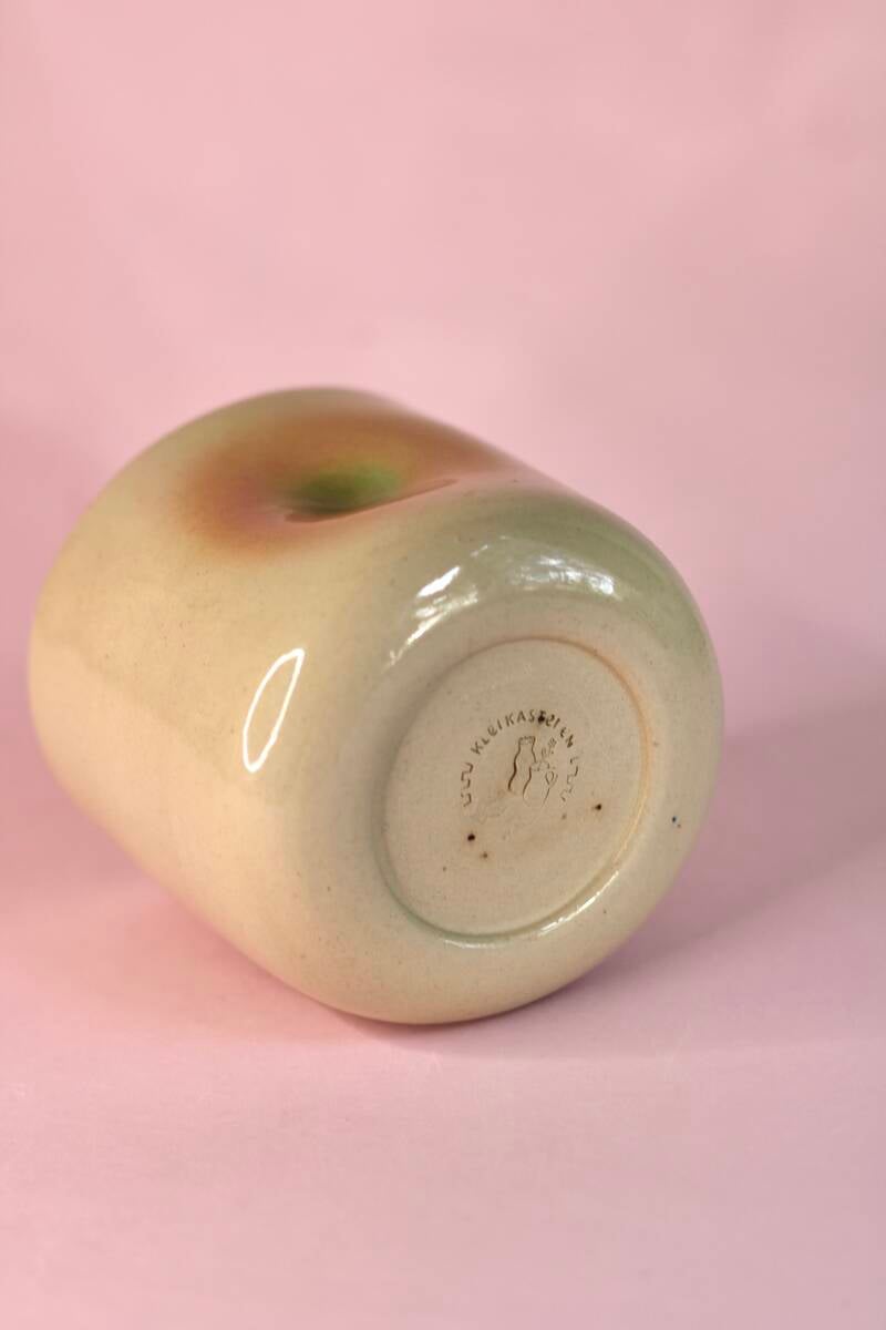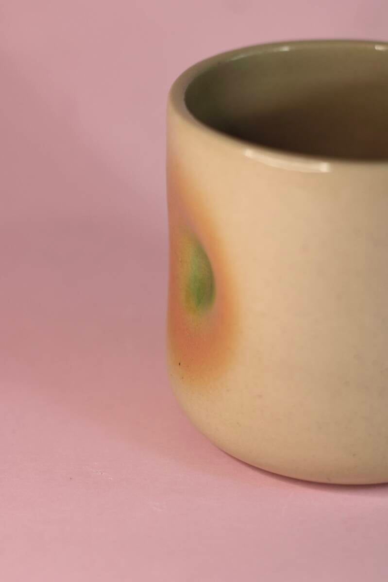 handgedraaid steengoed kopje met ingedeukte zijkanten. gemaakt van witte klei. gedecoreerd met geairbrushed onderglazuur in perzik, roze, en groene tinten aan beide kanten van het kopje. glanzend transparant glazuur aan binnen- en buitenkant.