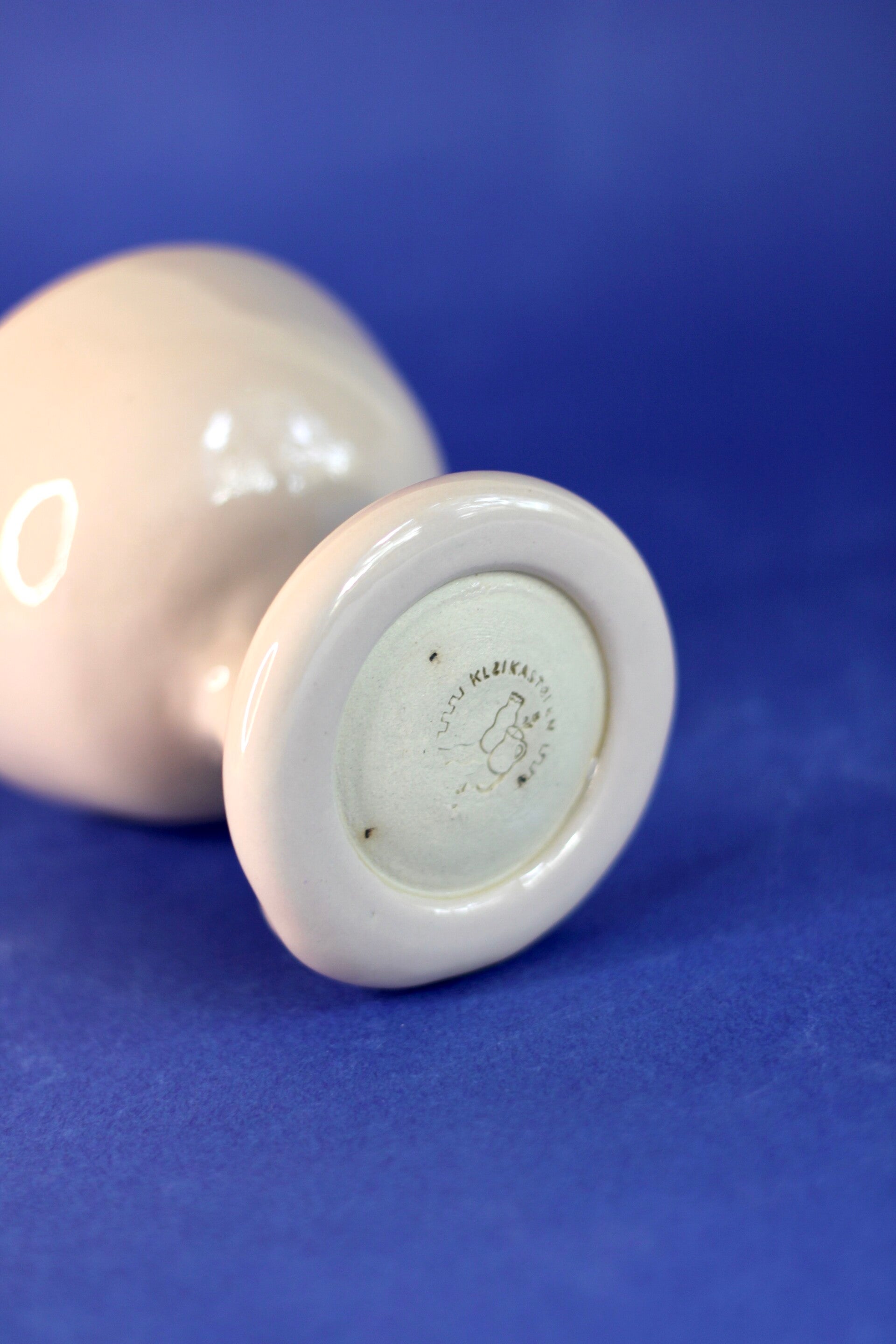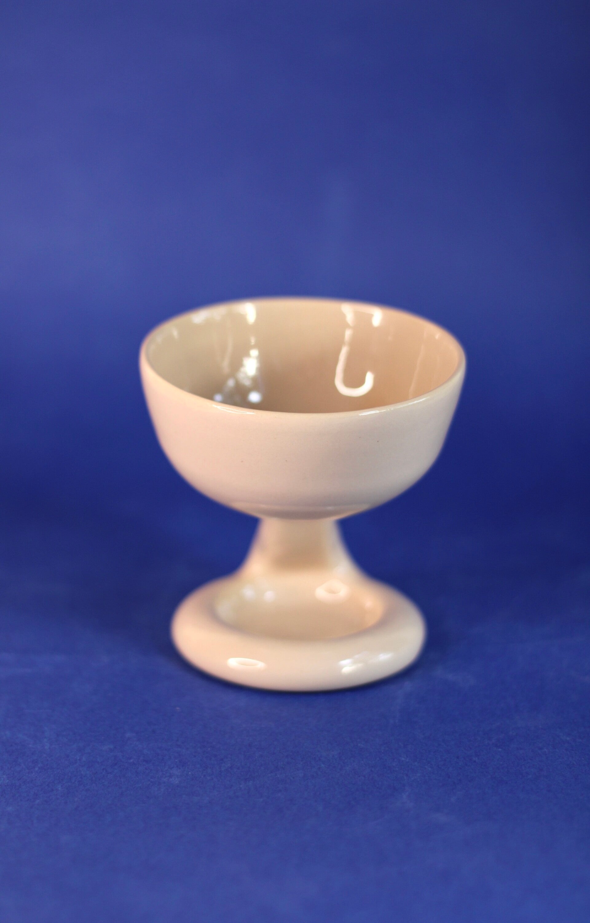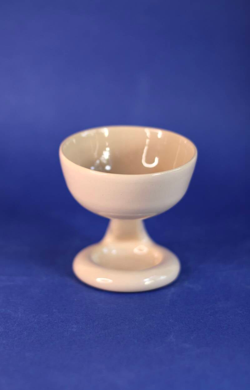 handgedraaid steengoed wijnglaasje met asymmetrische kromme steel. gemaakt van witte klei, geglazuurd met zacht roze glazuur.