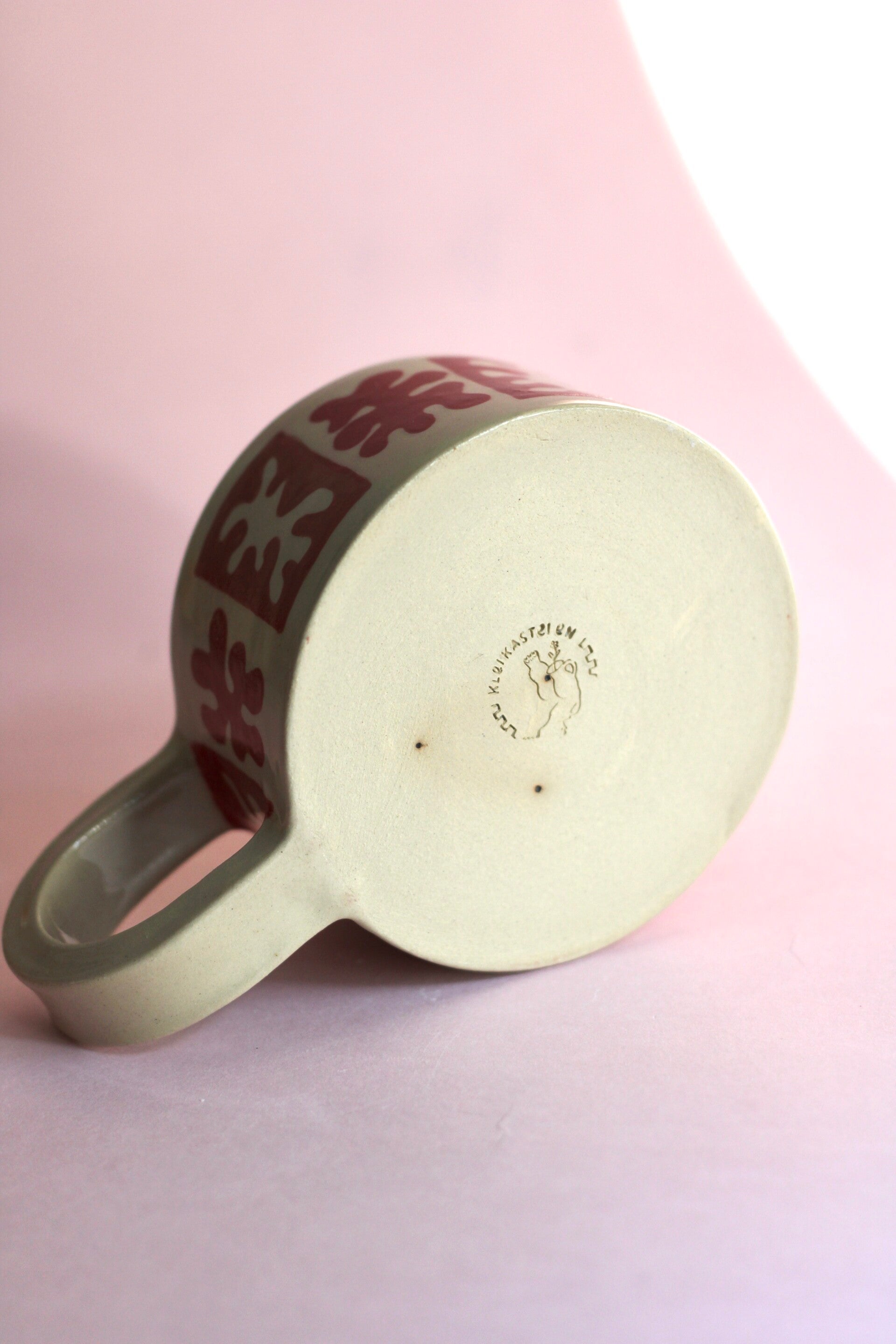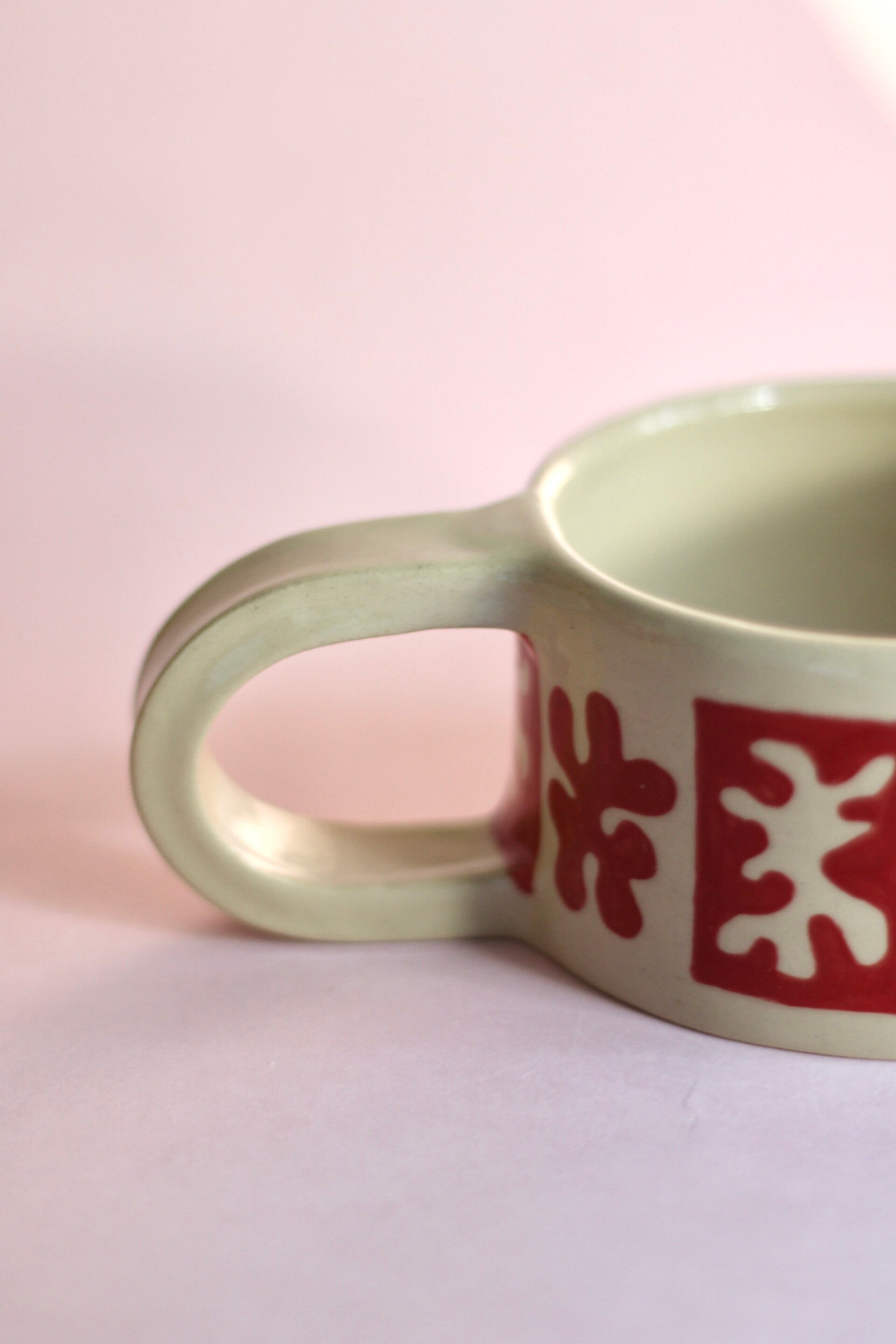 handgedraaid steengoed kopje met breed, plat oor. gemaakt van witte klei. gedecoreerd met rode organische vormen, waarna geglazuurd met transparant, glanzend glazuur.
