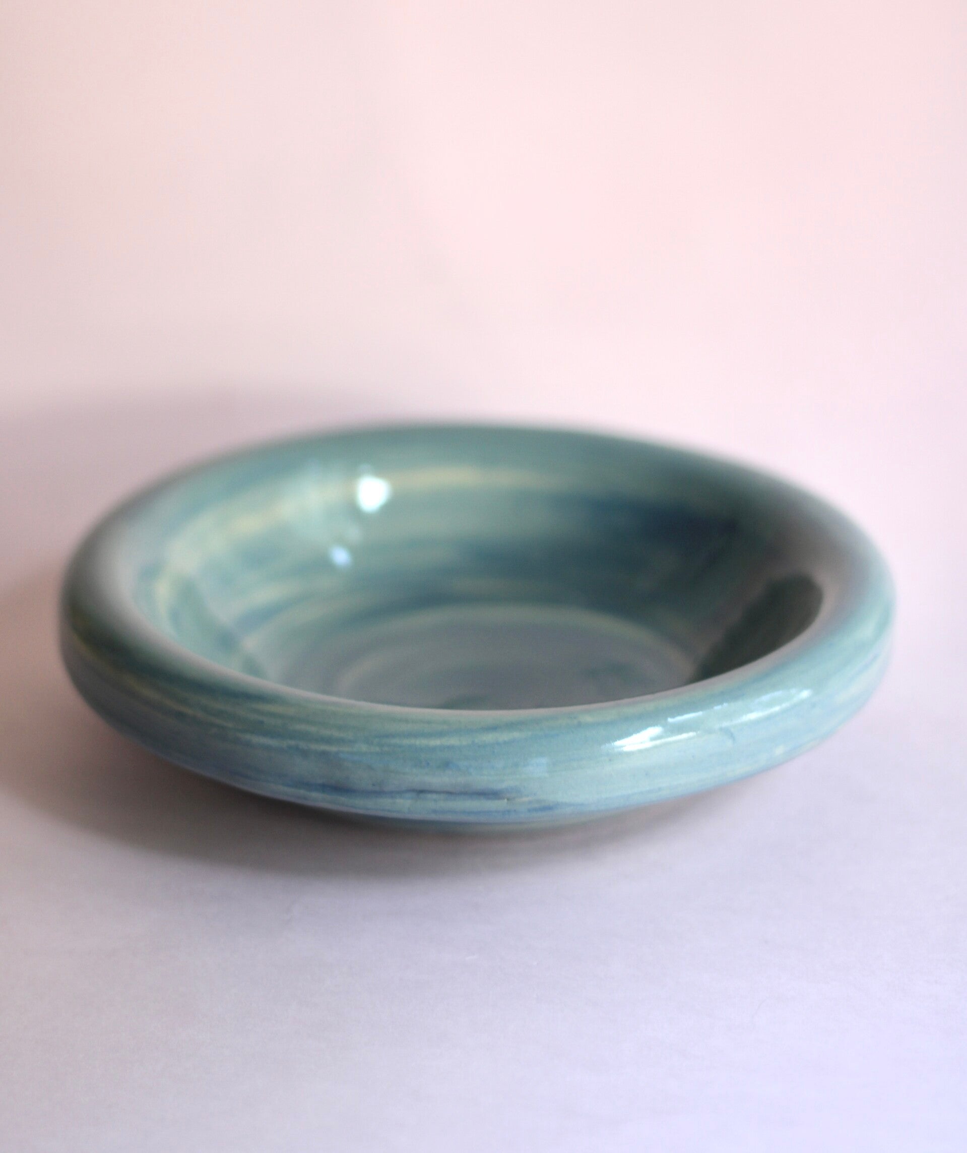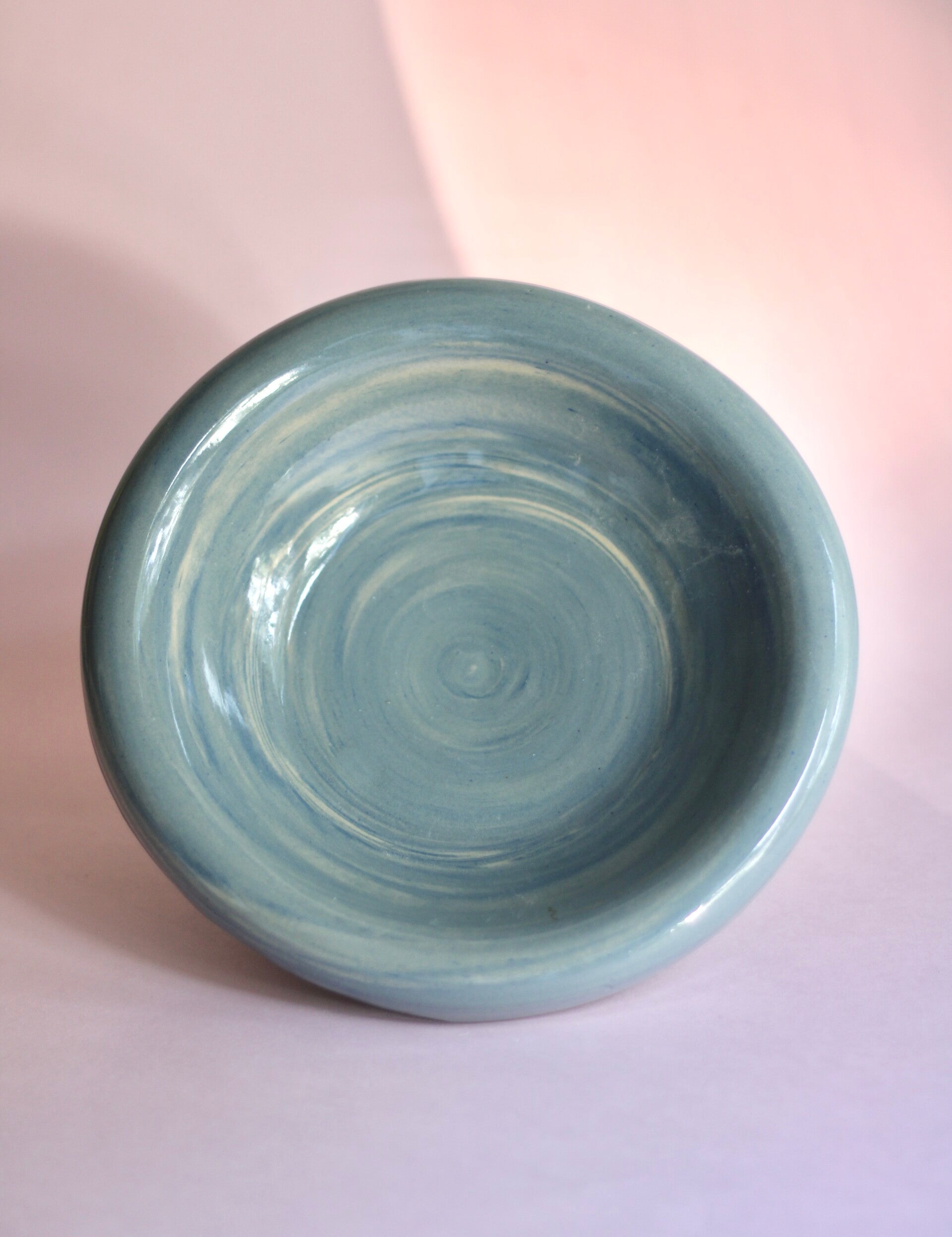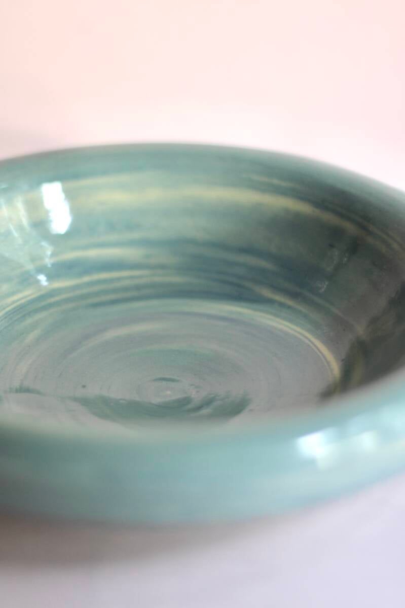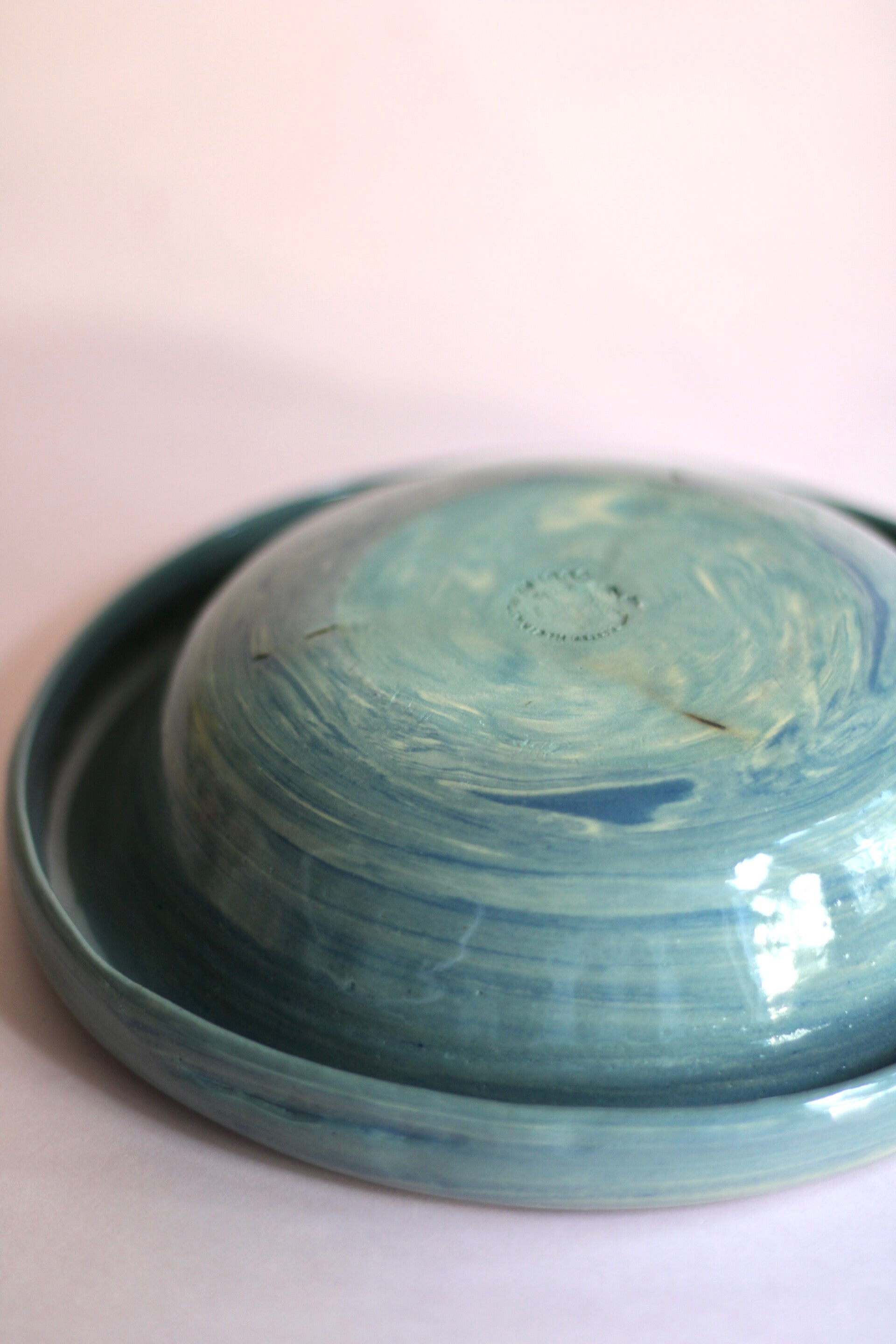 handgedraaid steengoed bord met omgeslagen rand. gemaakt van witte en blauwe klei. geglazuurd met transparant glanzend glazuur.