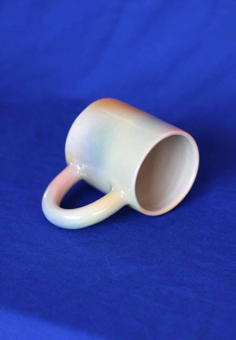 handgedraaide steengoed mok met groot oor. gemaakt van witte klei. gedecoreerd met verschillende airbrush kleuren en afgewerkt met transparant, glanzend glazuur.