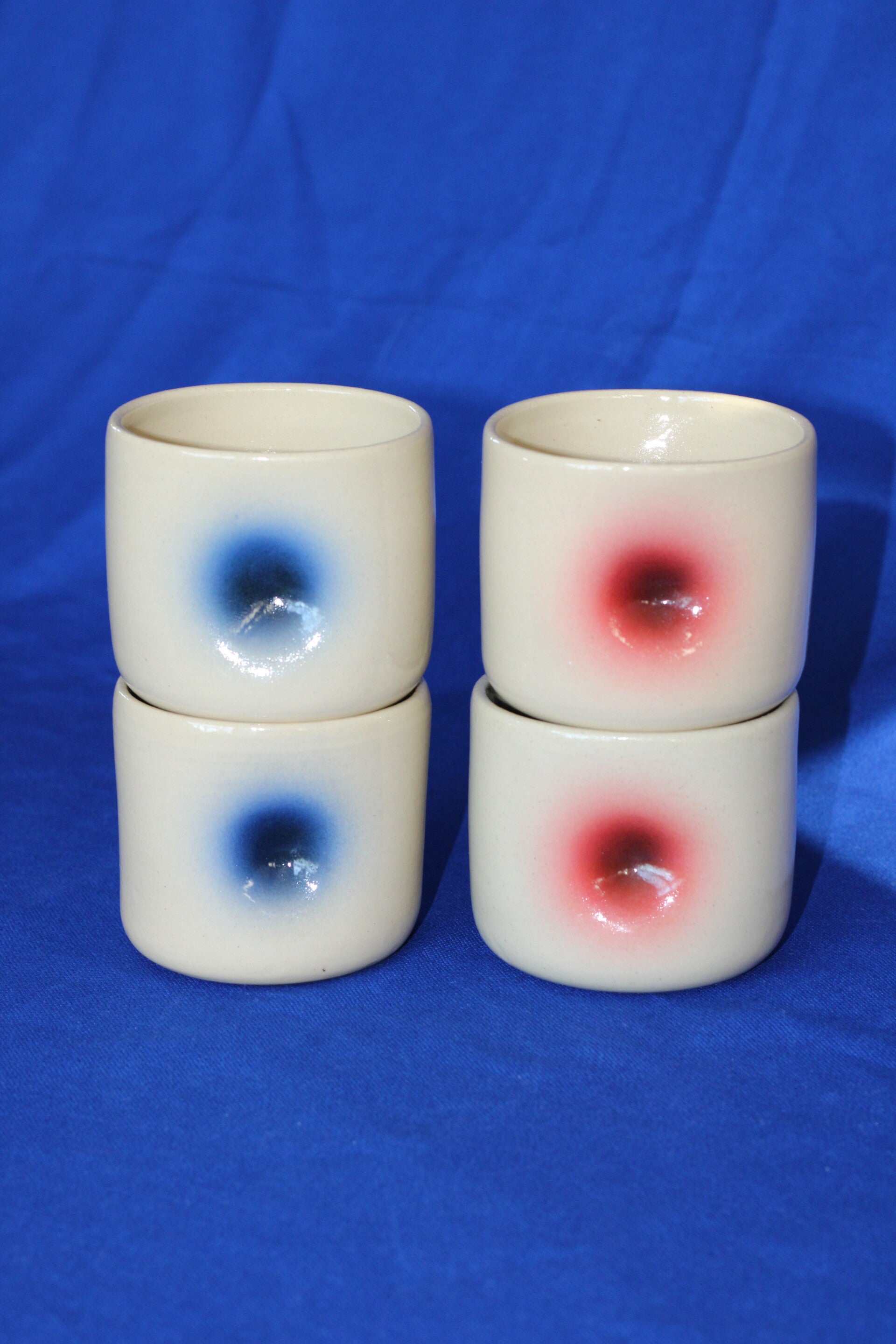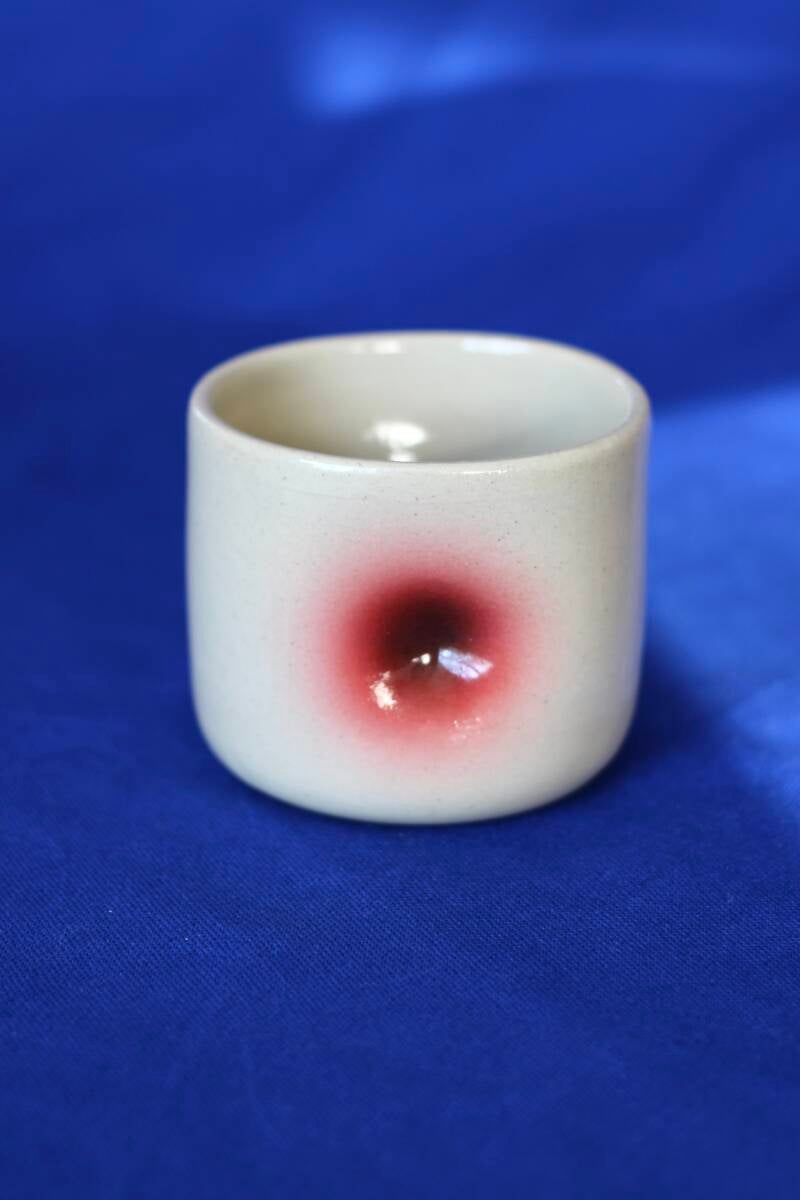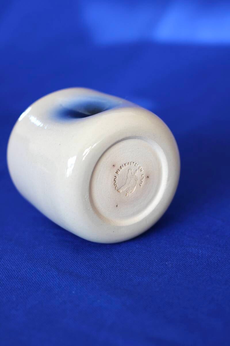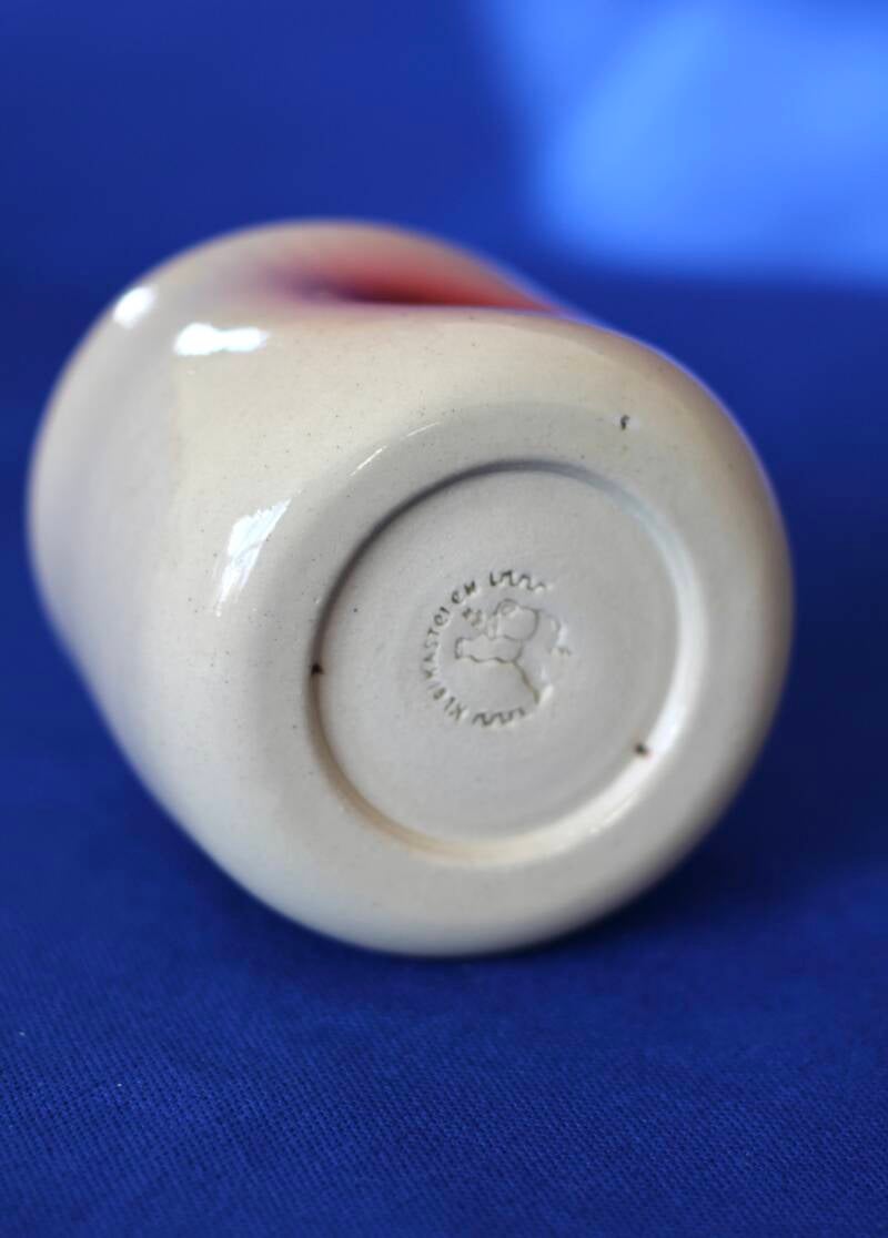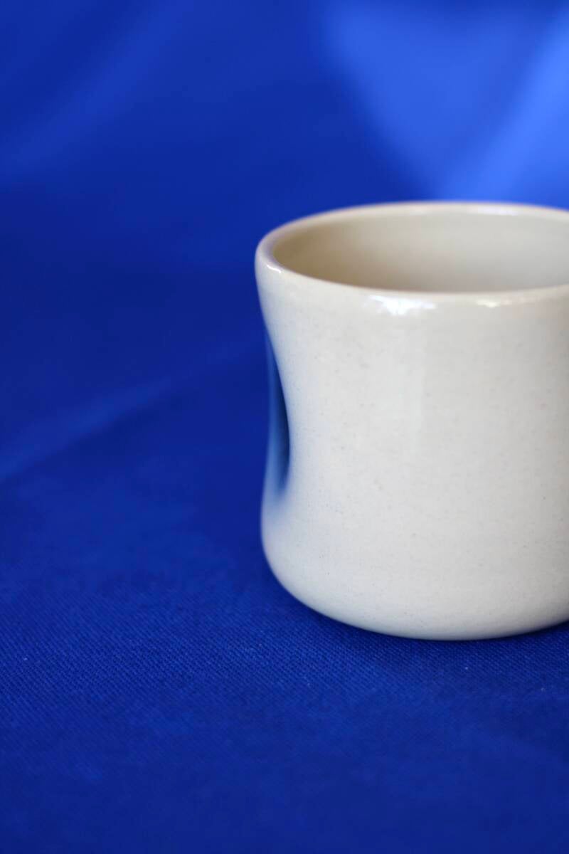 handgedraaid steengoed kopje met met ingedeukte zijkanten. gemaakt van witte klei. gedecoreerd met airbrushed effect en afgewerkt met transparant, glanzend glazuur.