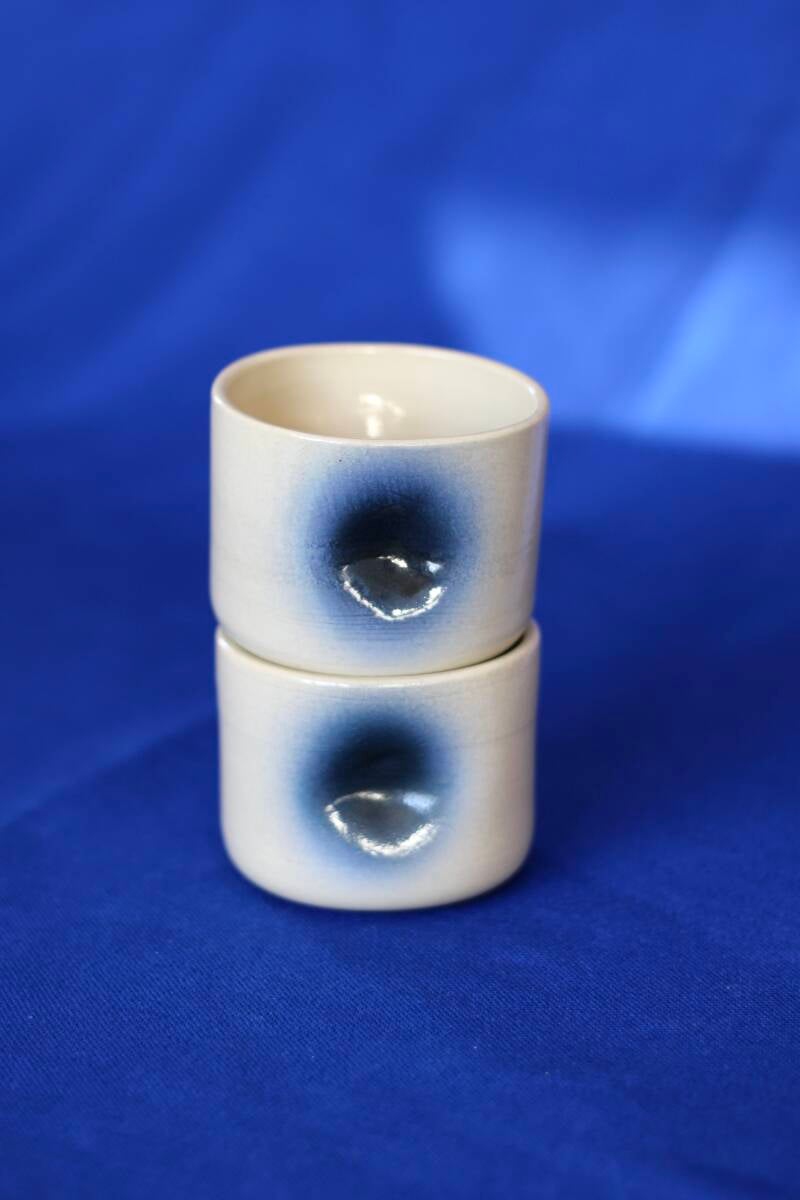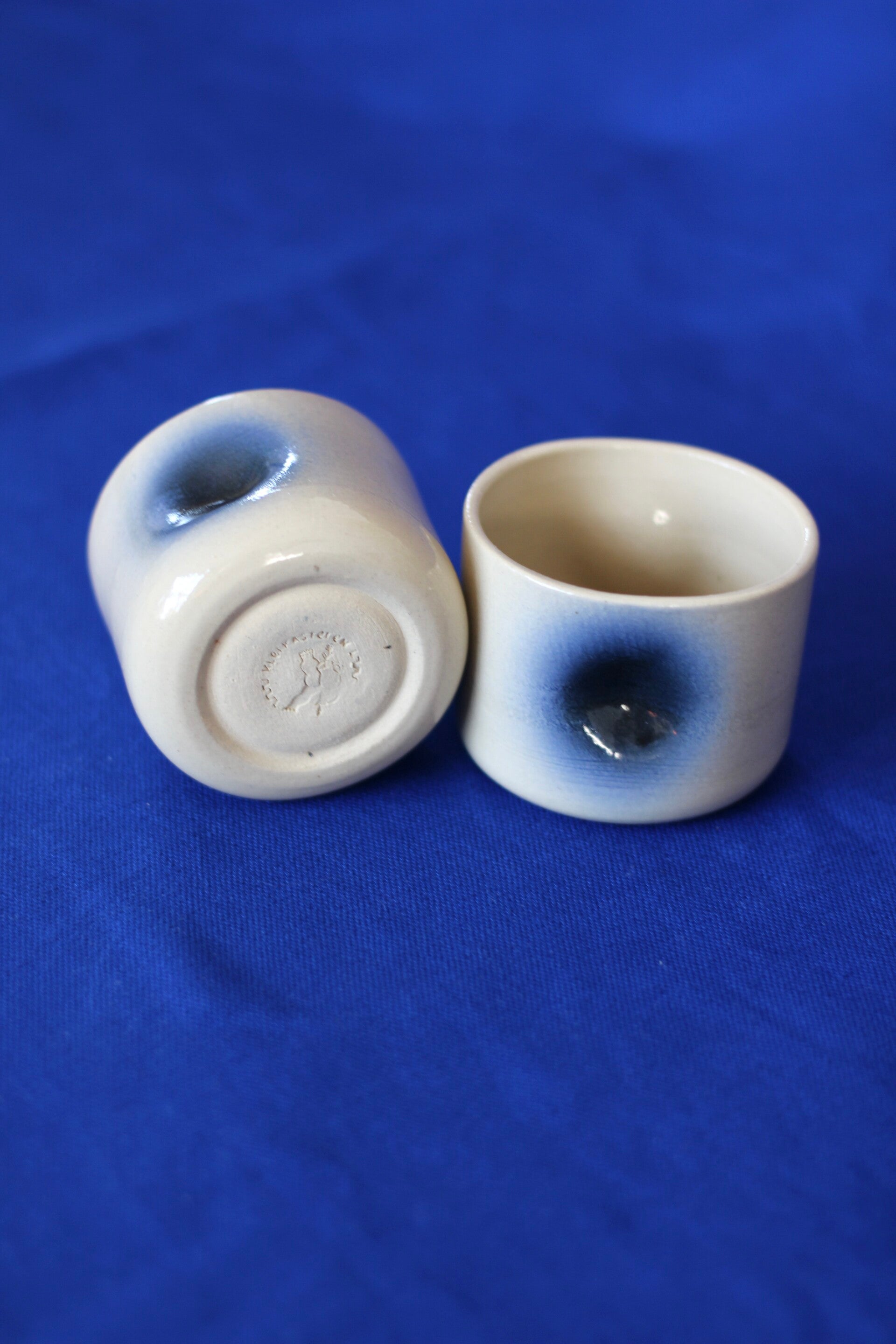 handgedraaid steengoed kopje met met ingedeukte zijkanten. gemaakt van witte klei. gedecoreerd met airbrush en afgewerkt met transparant, glanzend glazuur.