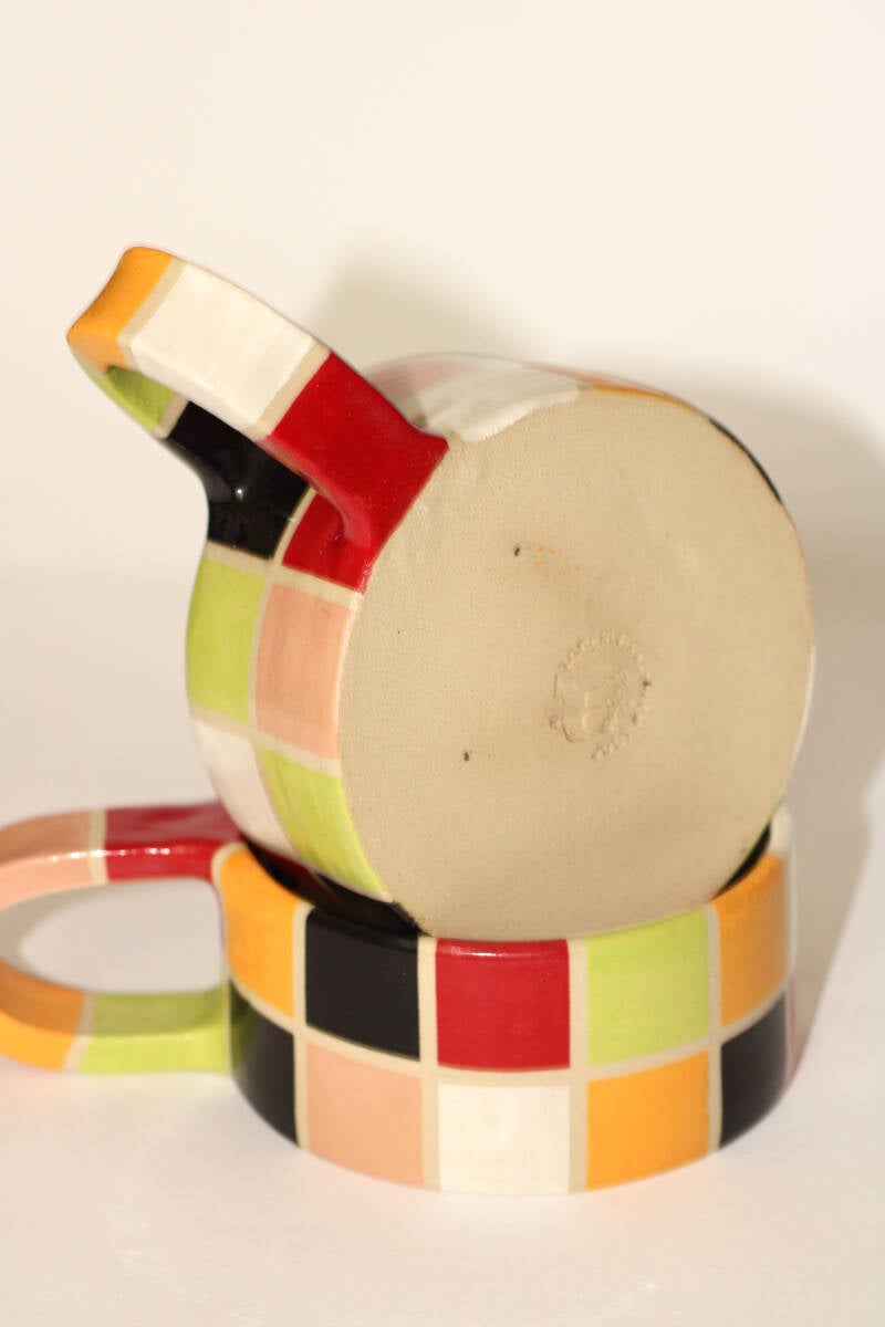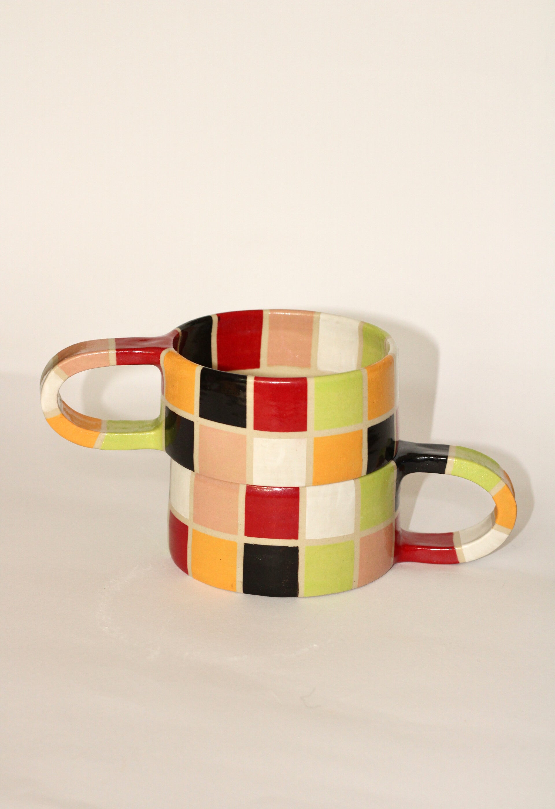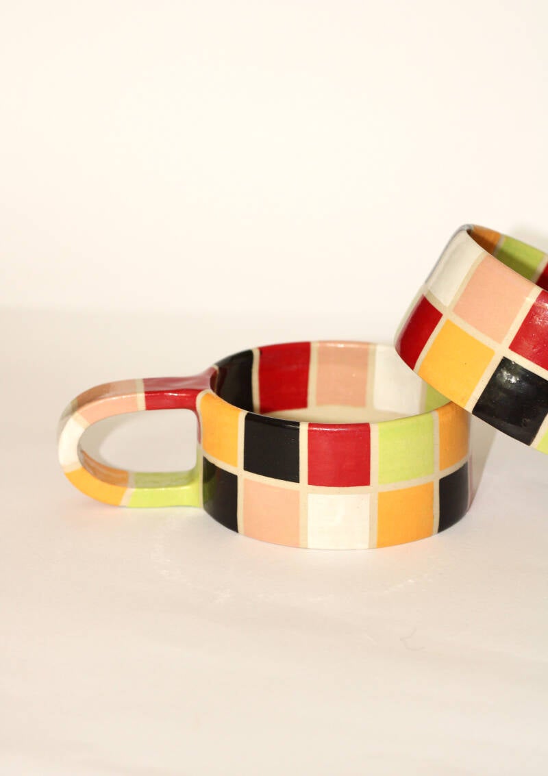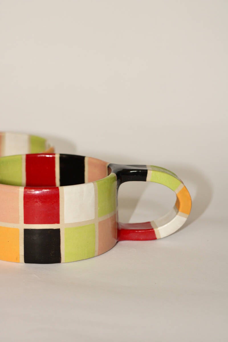 handgedraaid steengoed kopje met breed, plat oor. gemaakt van witte klei. gedecoreerd met blokjes in verschillende kleuren, waarna geglazuurd met transparant, glanzend glazuur.