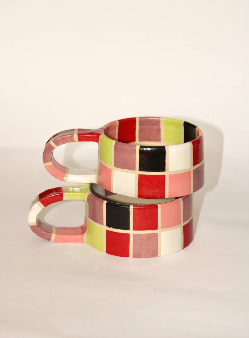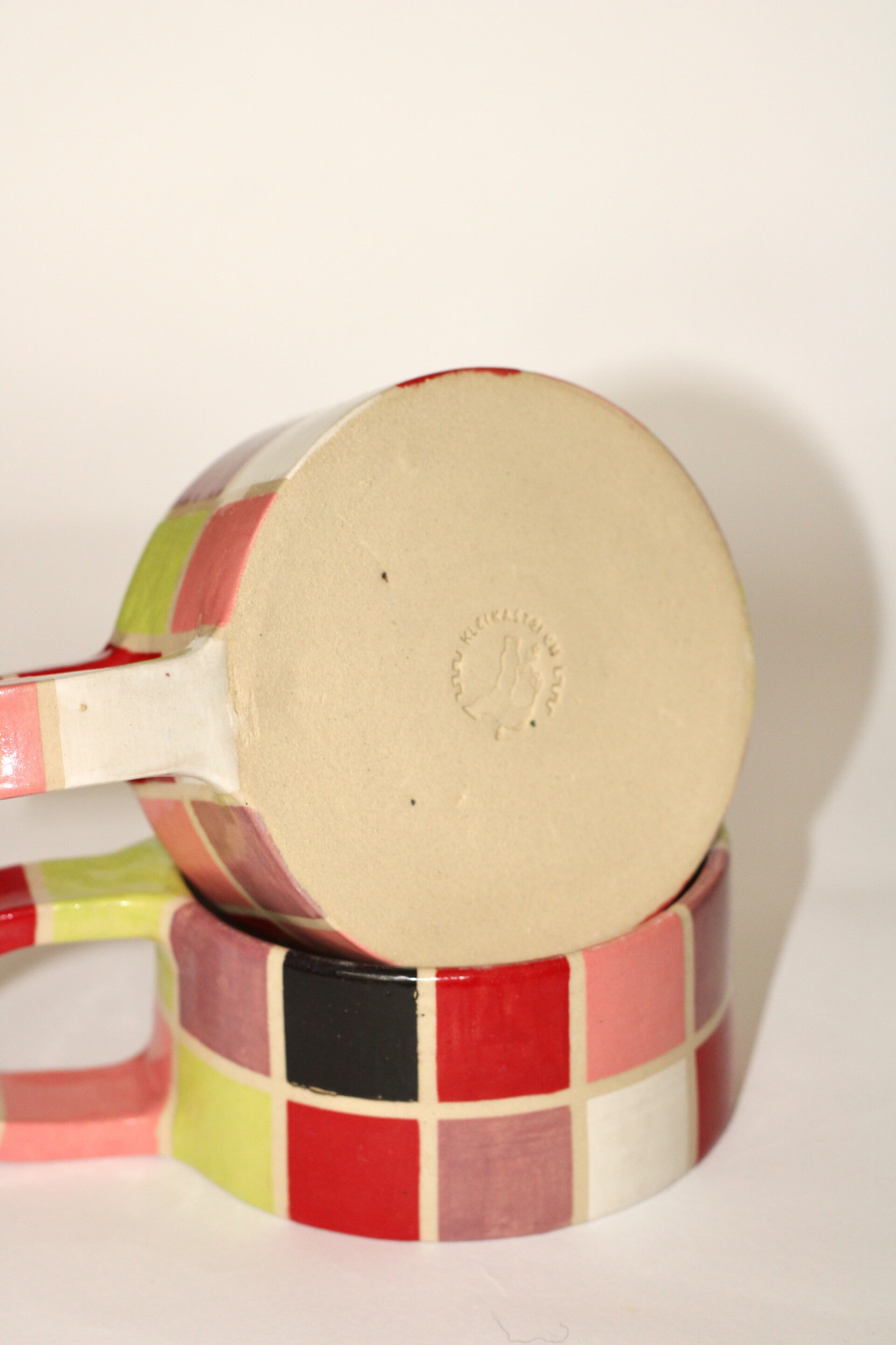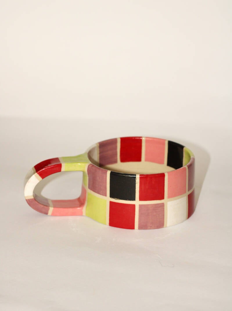 handgedraaid steengoed kopje met breed, plat oor. gemaakt van witte klei. gedecoreerd met blokjes in verschillende kleuren, waarna geglazuurd met transparant, glanzend glazuur.