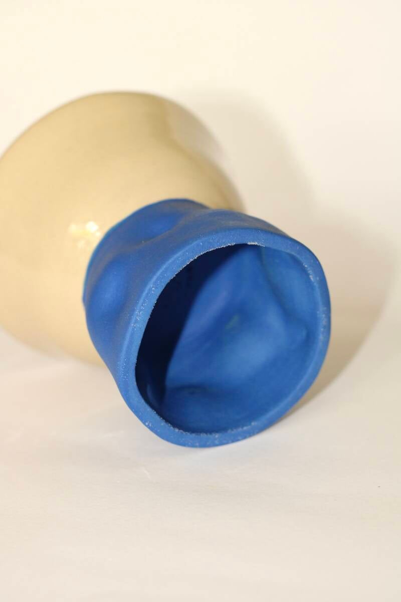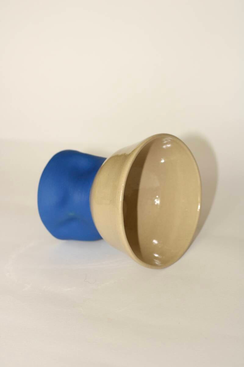 handgedraaid steengoed kopje. gemaakt van witte klei. beschilderd met blauw onderglazuur. afgewerkt met glanzend glazuur.