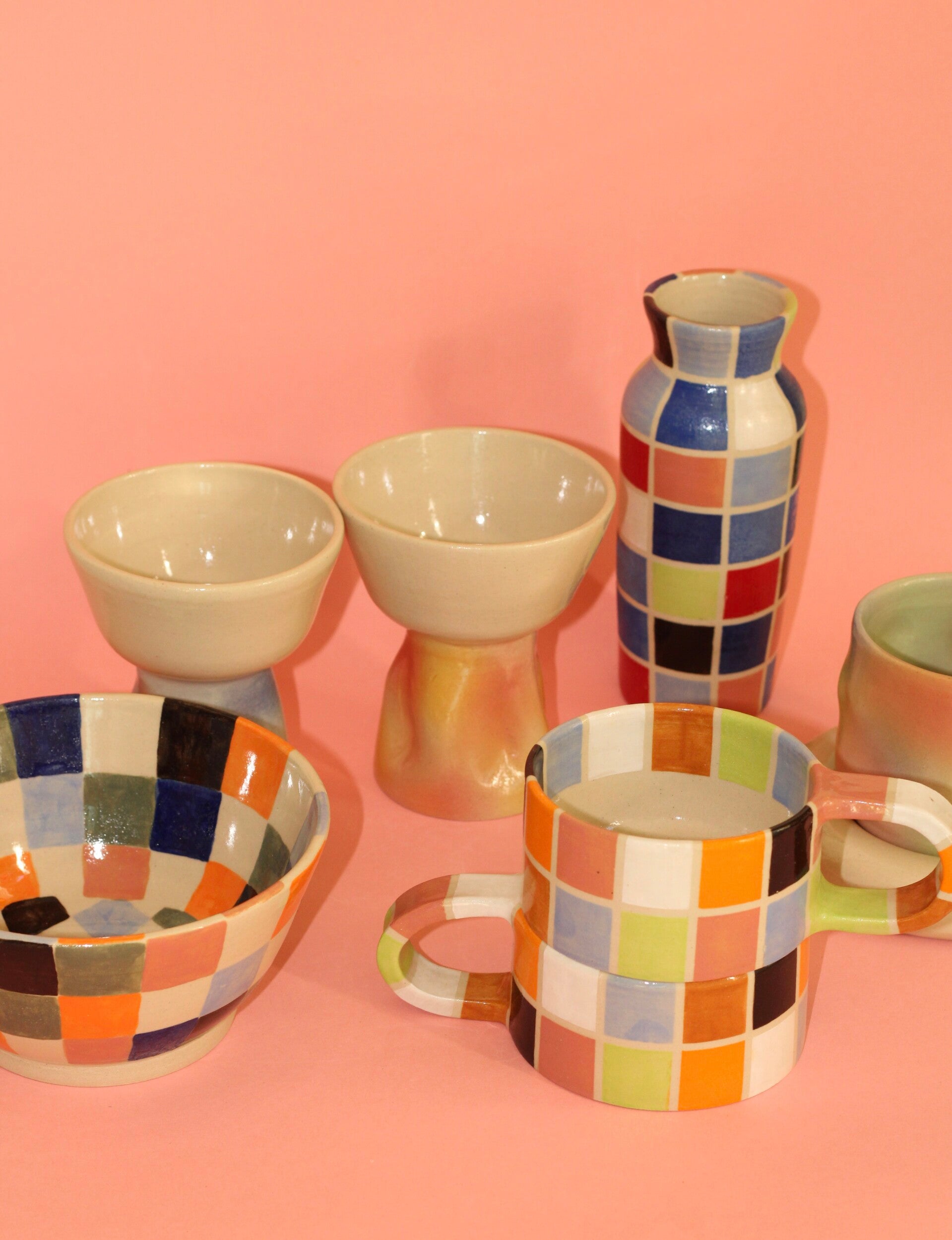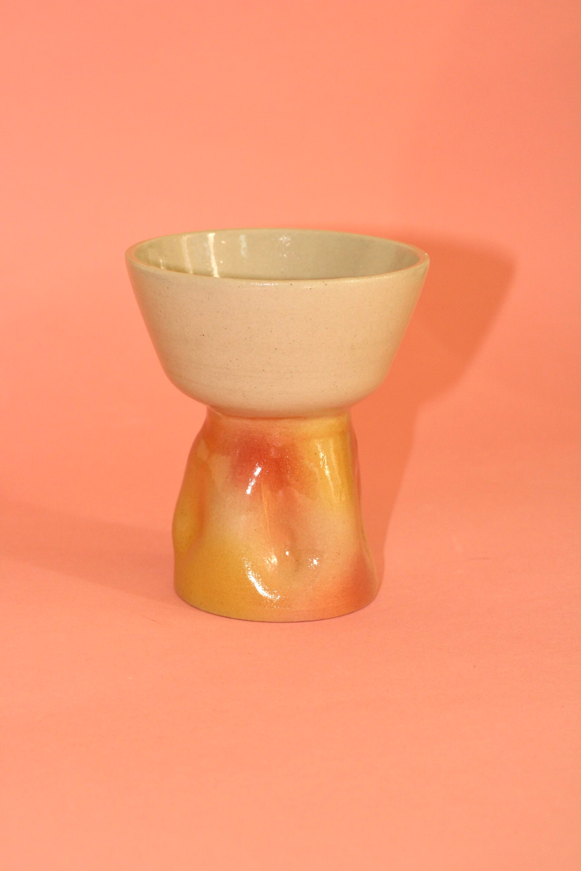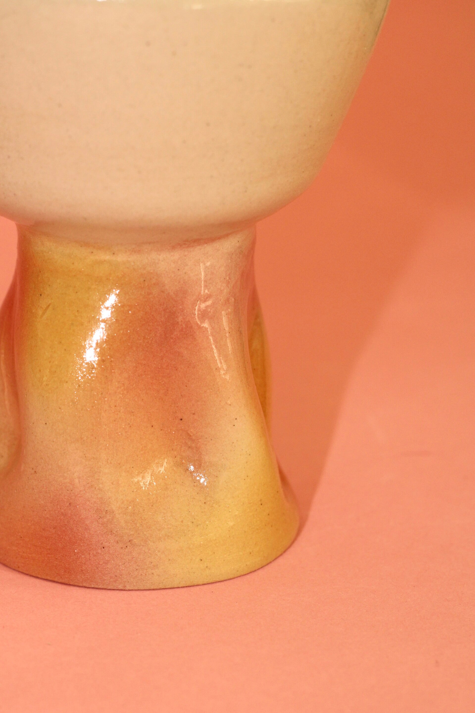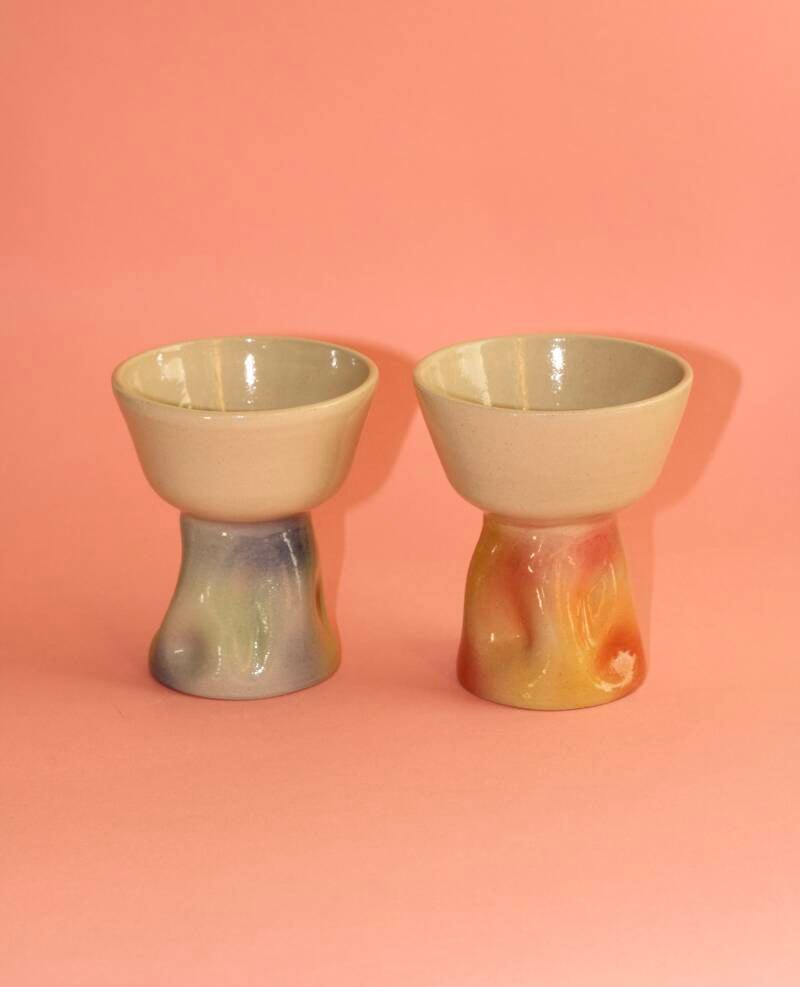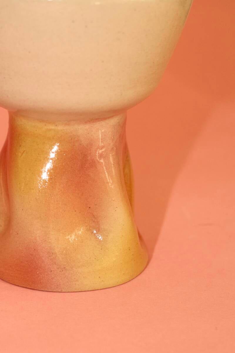 handgedraaide steengoed wijnbeker. gemaakt van witte klei. gedecoreerd met verschillende kleuren airbrushed onderglazuur, waarna geglazuurd met transparant, glanzend glazuur.