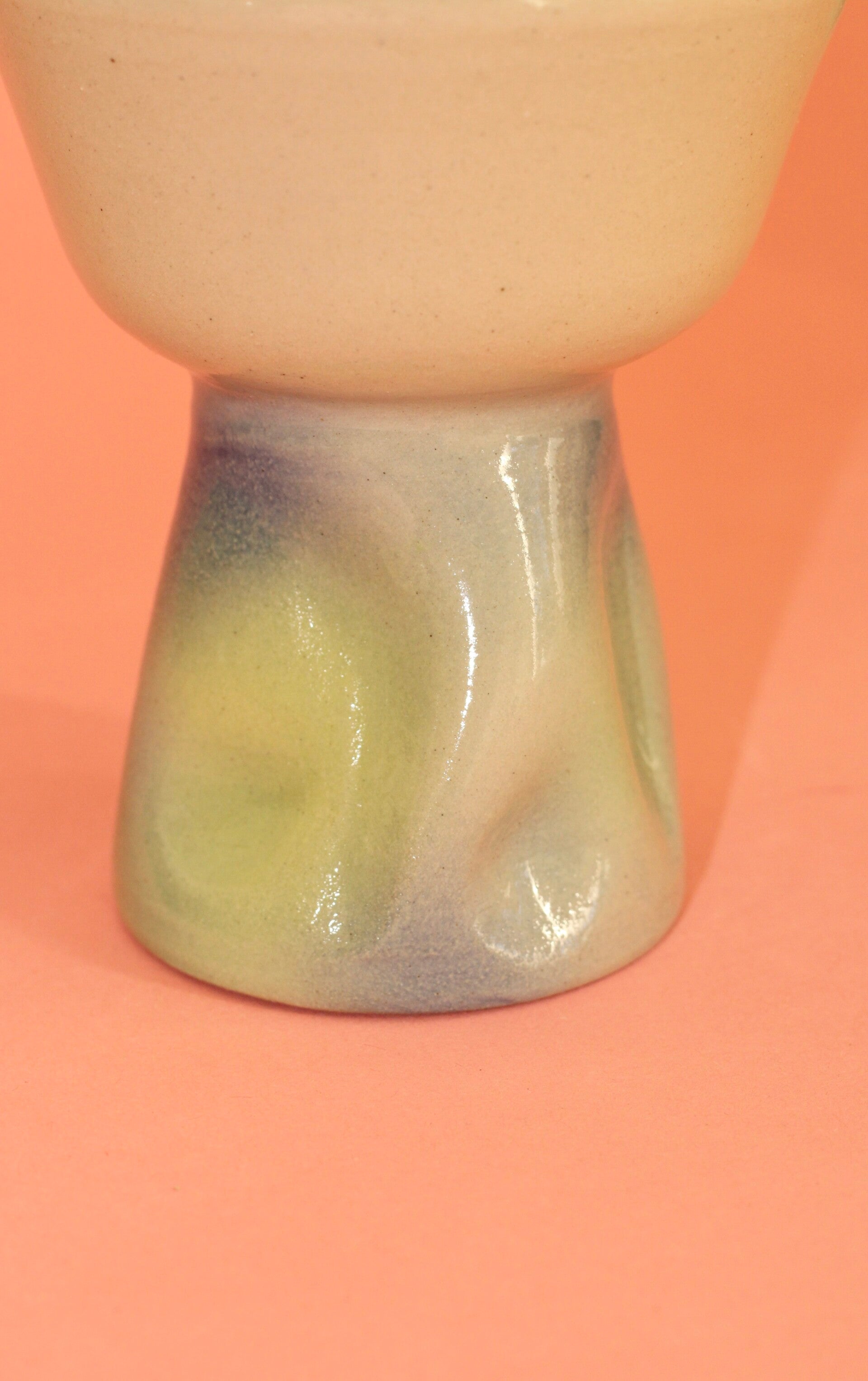 handgedraaide steengoed wijnbeker. gemaakt van witte klei. gedecoreerd met verschillende kleuren airbrushed onderglazuur, waarna geglazuurd met transparant, glanzend glazuur.