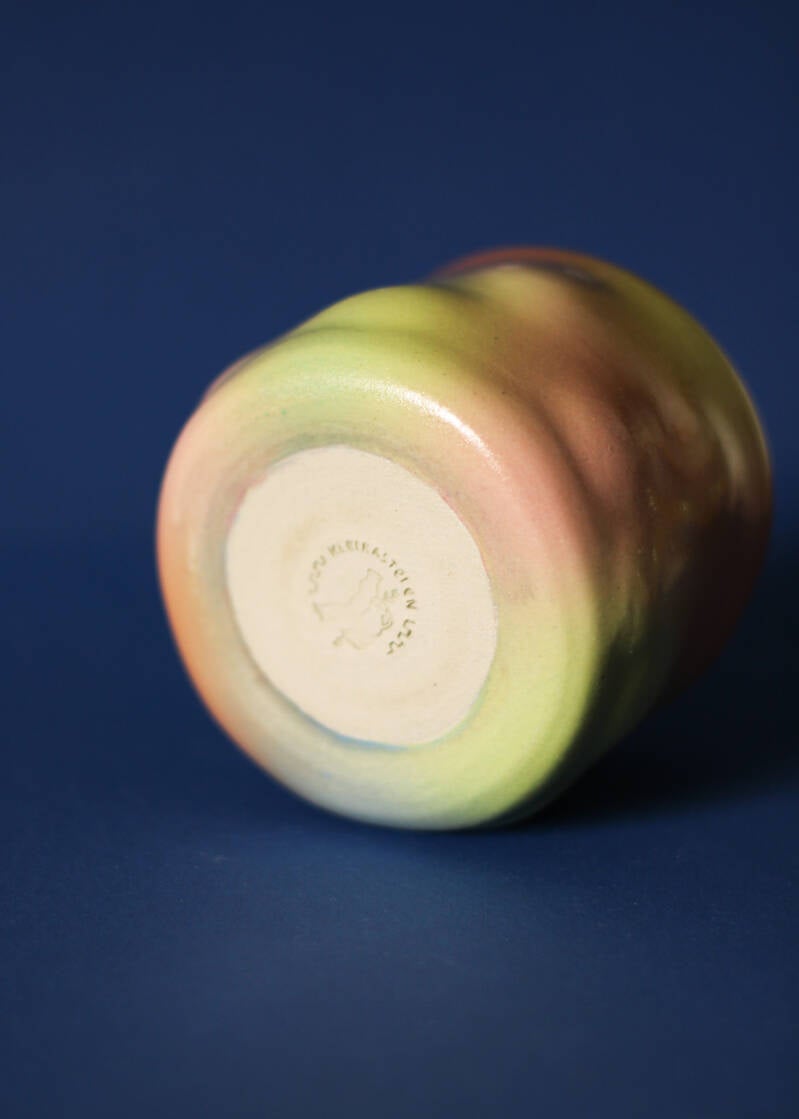 wheel thrown ceramic cup with airbrushed design in light pastel colors. dishwasher safe, but hand washing is recommended.