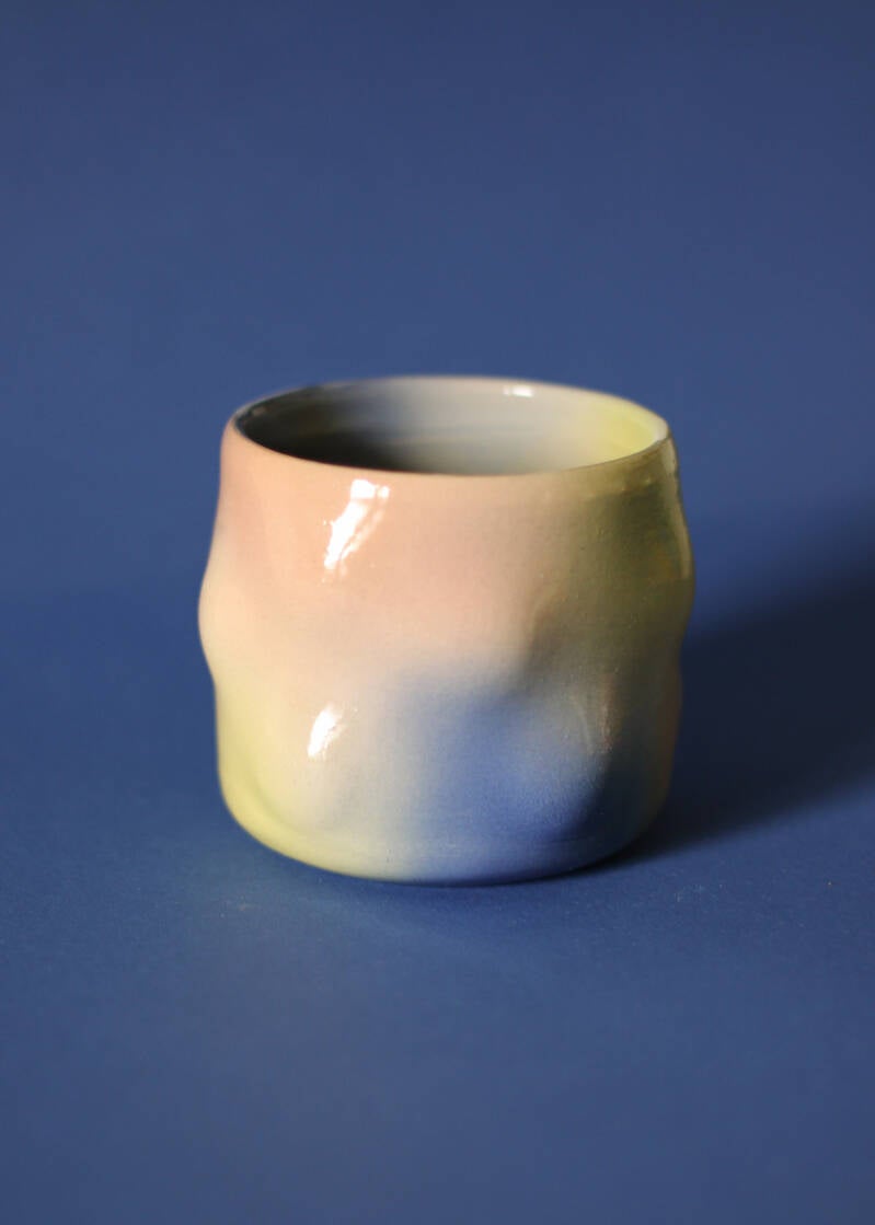 wheel thrown ceramic cup with airbrushed design in pink, green and blue. dishwasher safe, but hand washing is recommended.