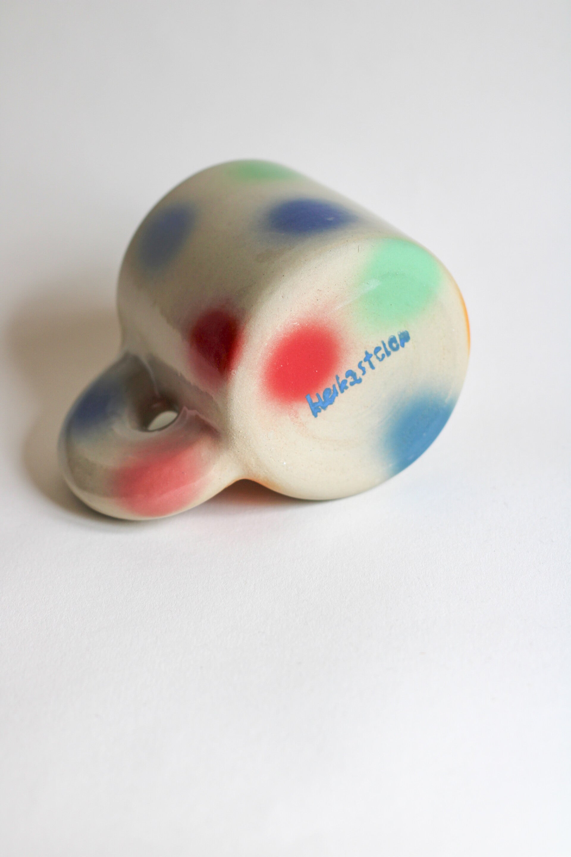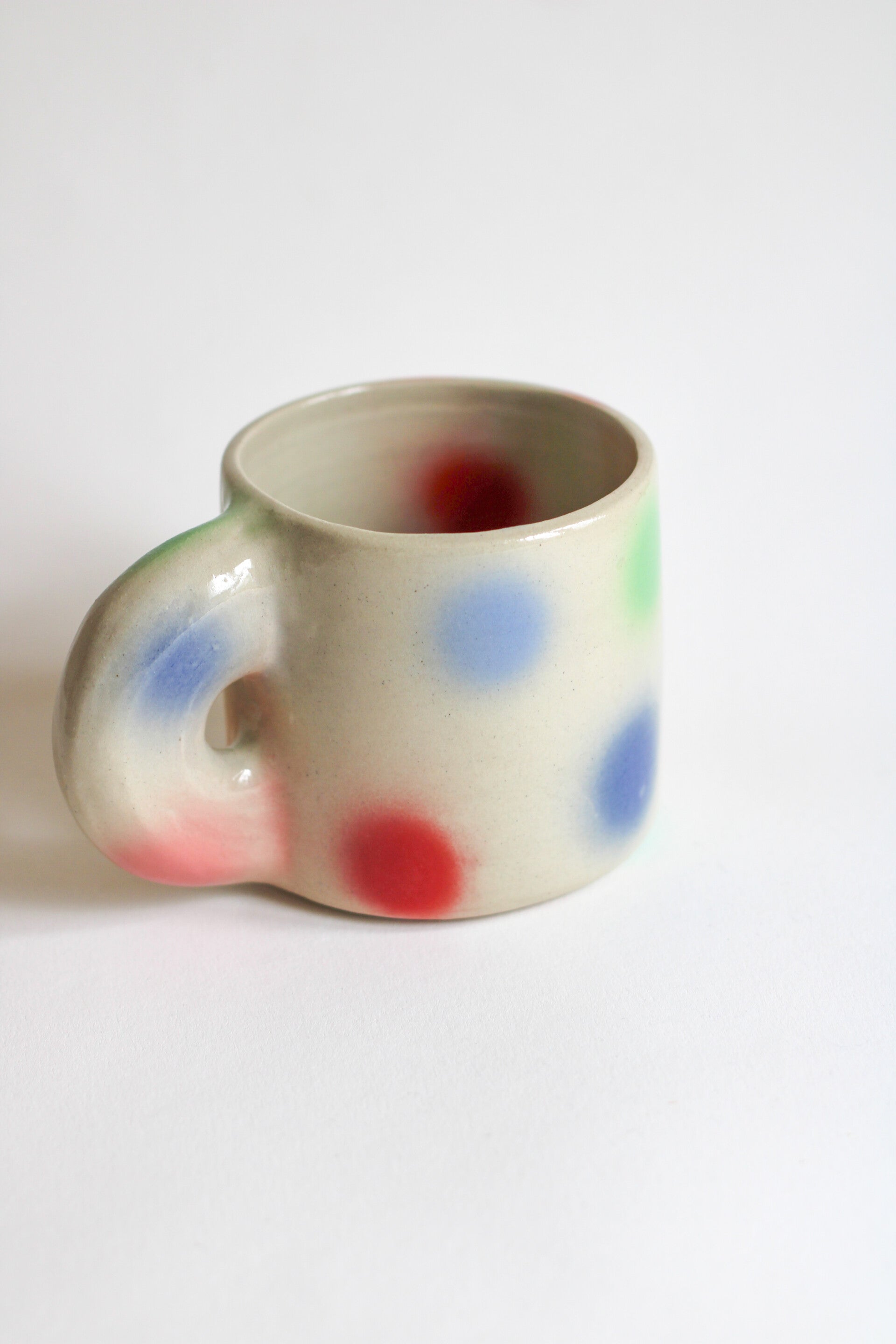 wheel thrown ceramic mug with a chunky ear and colorful, airbrushed dots all over.