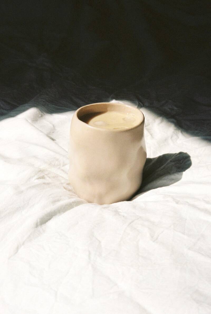 handgedraaid steengoed kopje. gemaakt van witte klei. lichtroze, satijnen glazuur aan binnen- en buitenkant.