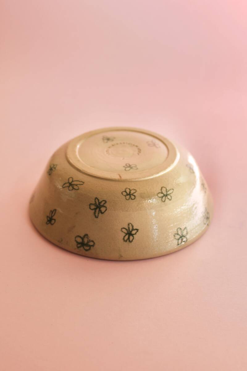 handgedraaid steengoed schaaltje. gemaakt van witte klei. gedecoreerd met donkergroen glazuurpotlood, daaroverheen een transparant, glanzend glazuur aan binnen- en buitenkant.