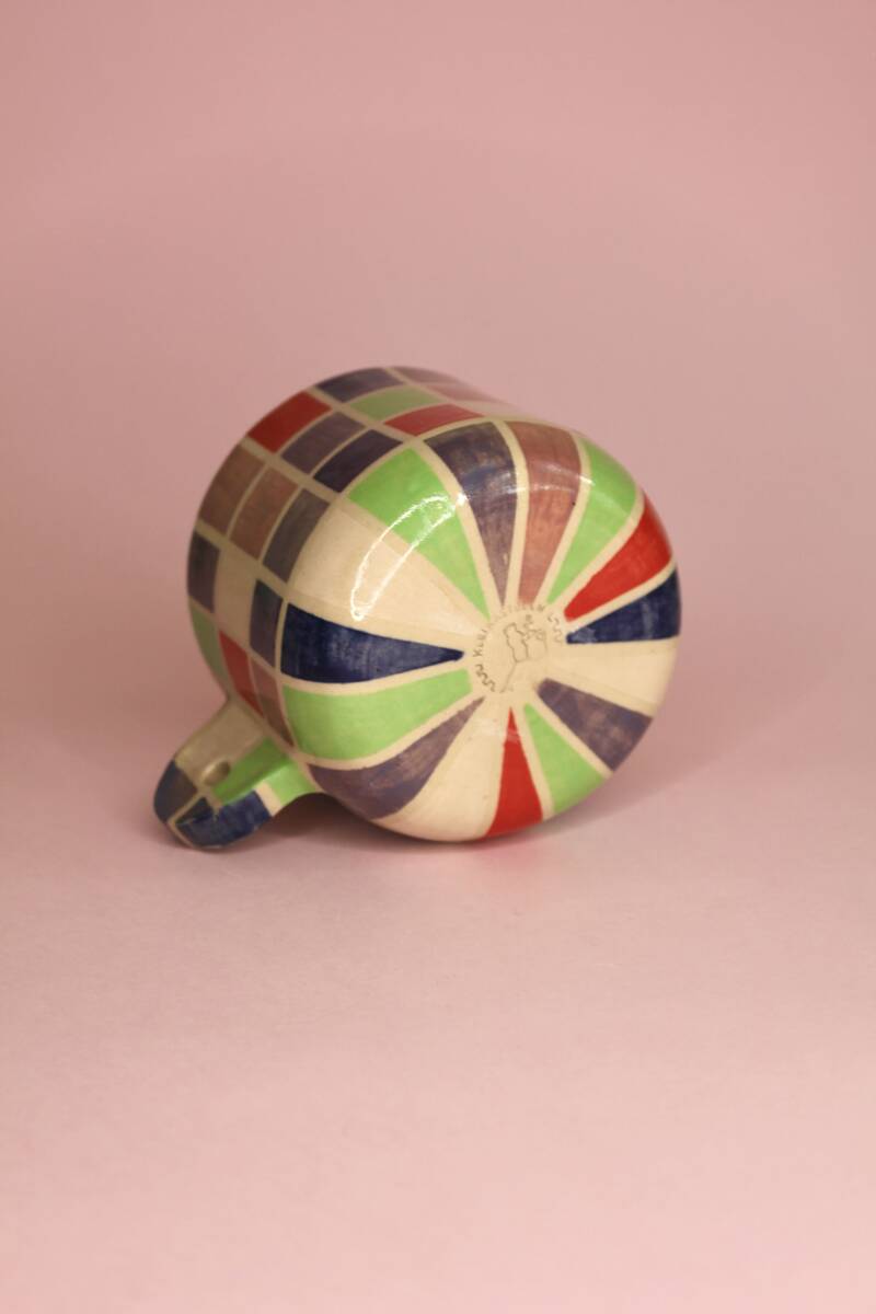 handgedraaid steengoed mokje. gemaakt van witte klei. gedecoreerd met verschillende kleuren onderglazuur in blokjespatroon. afgewerkt met glanzend transparant glazuur aan binnen- en buitenkant.