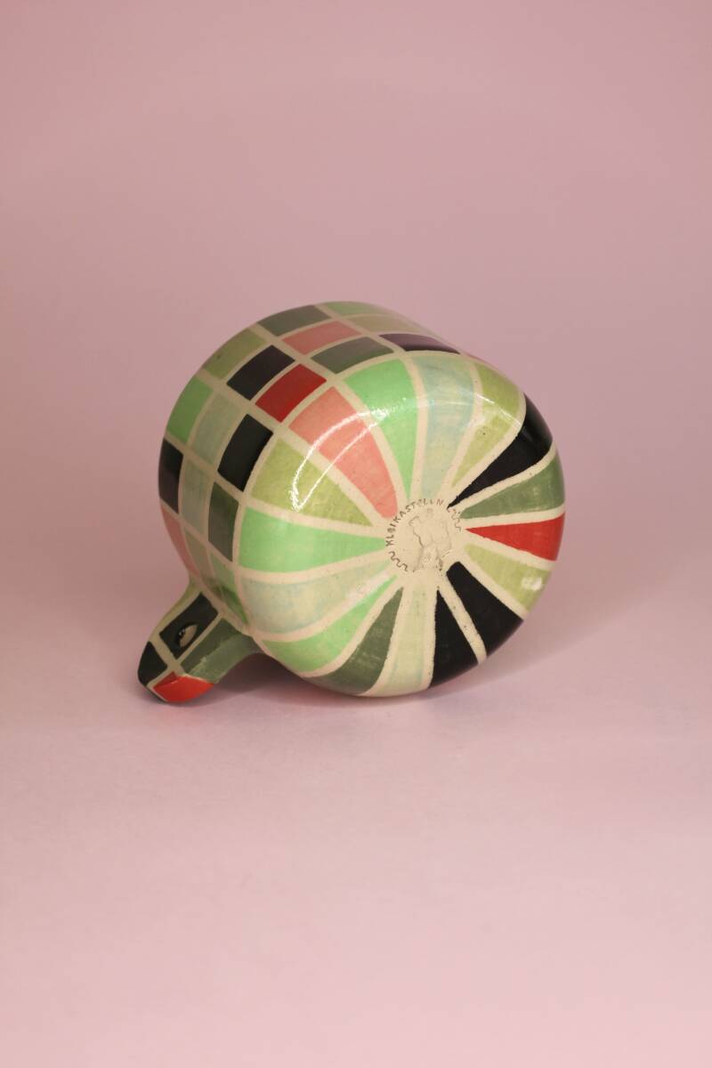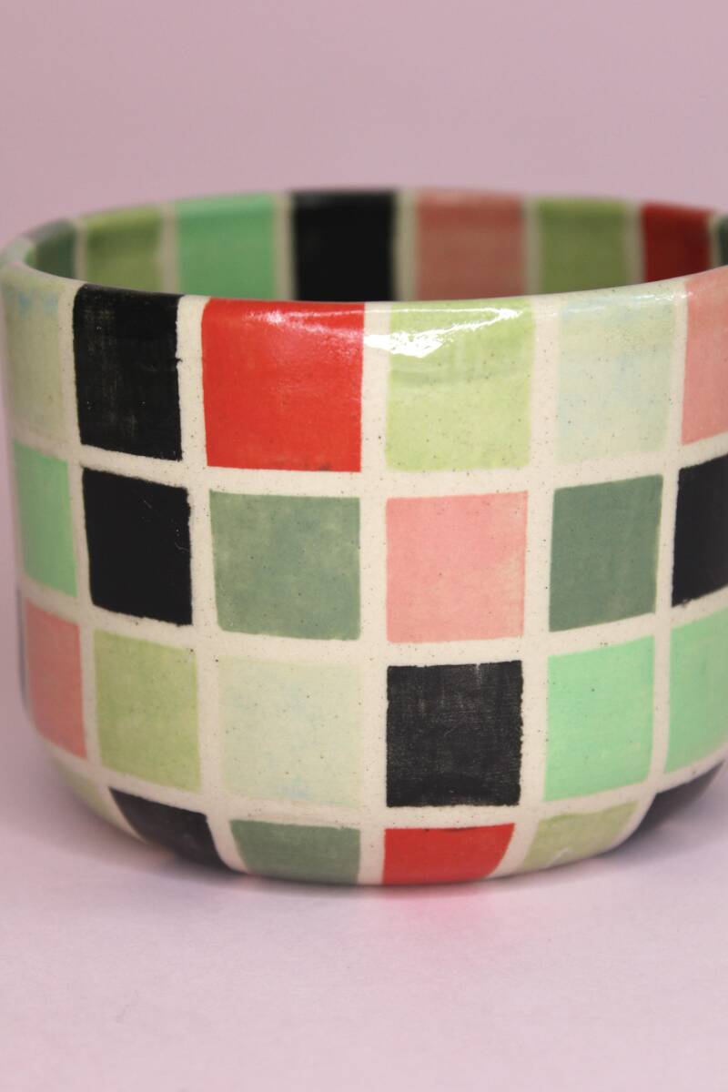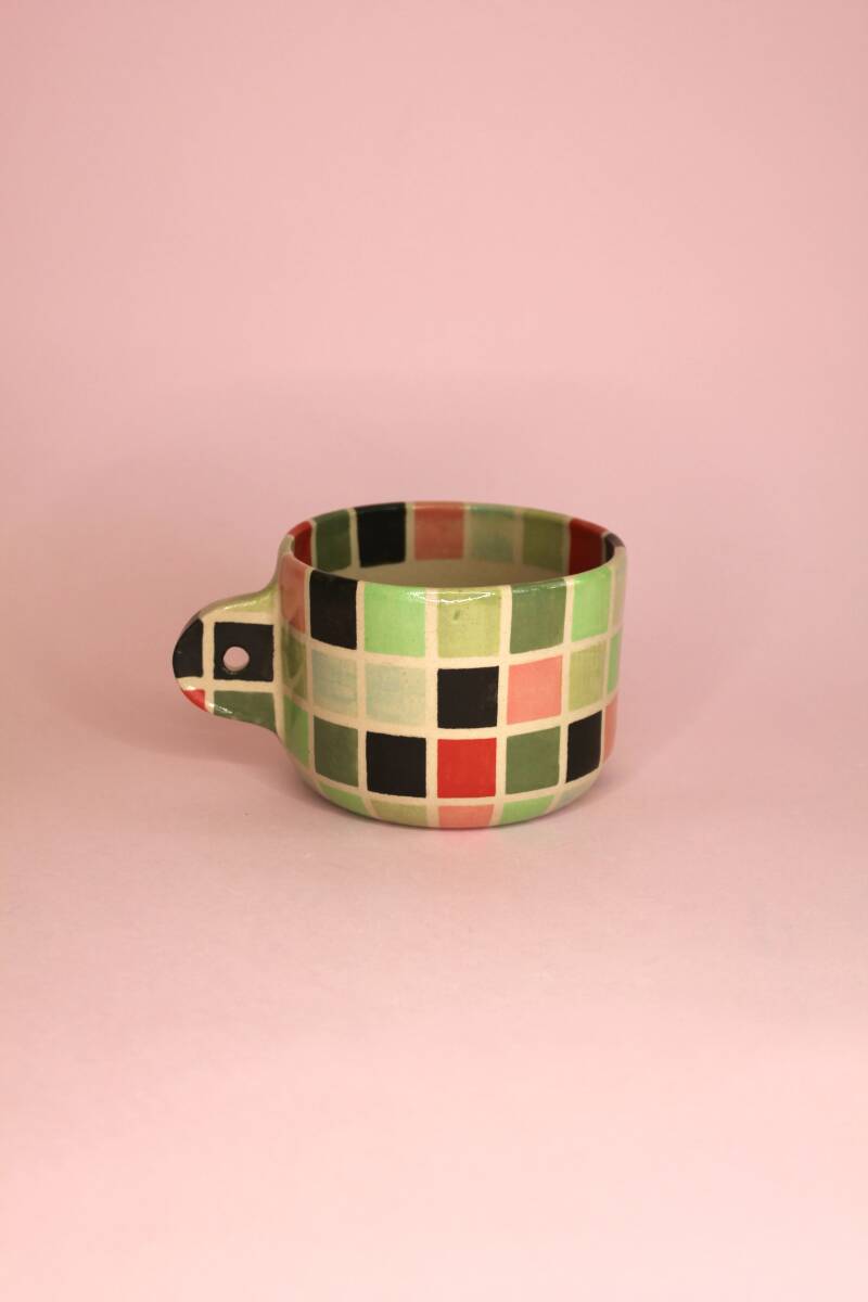handgedraaid steengoed mokje. gemaakt van witte klei. gedecoreerd met verschillende kleuren onderglazuur in blokjespatroon. afgewerkt met glanzend transparant glazuur aan binnen- en buitenkant.