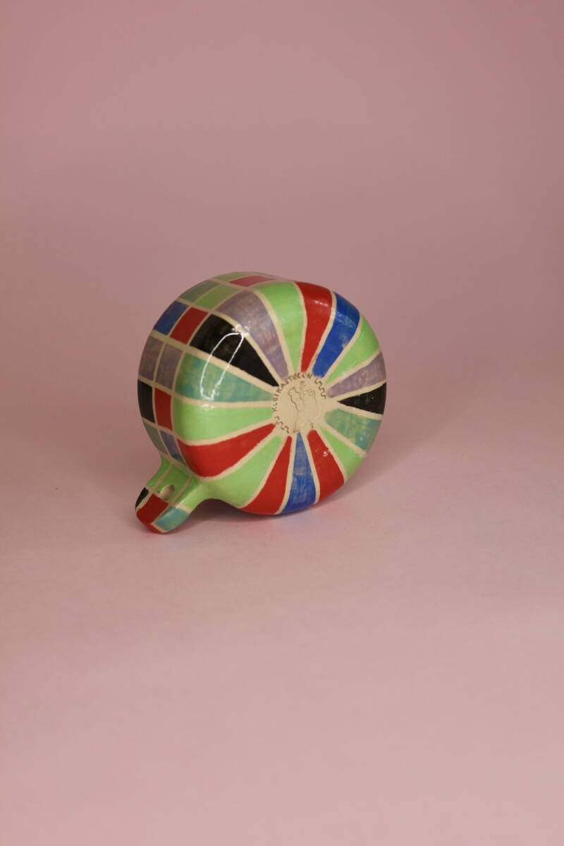 handgedraaid steengoed mokje. gemaakt van witte klei. gedecoreerd met verschillende kleuren onderglazuur in blokjespatroon. afgewerkt met glanzend transparant glazuur aan binnen- en buitenkant.