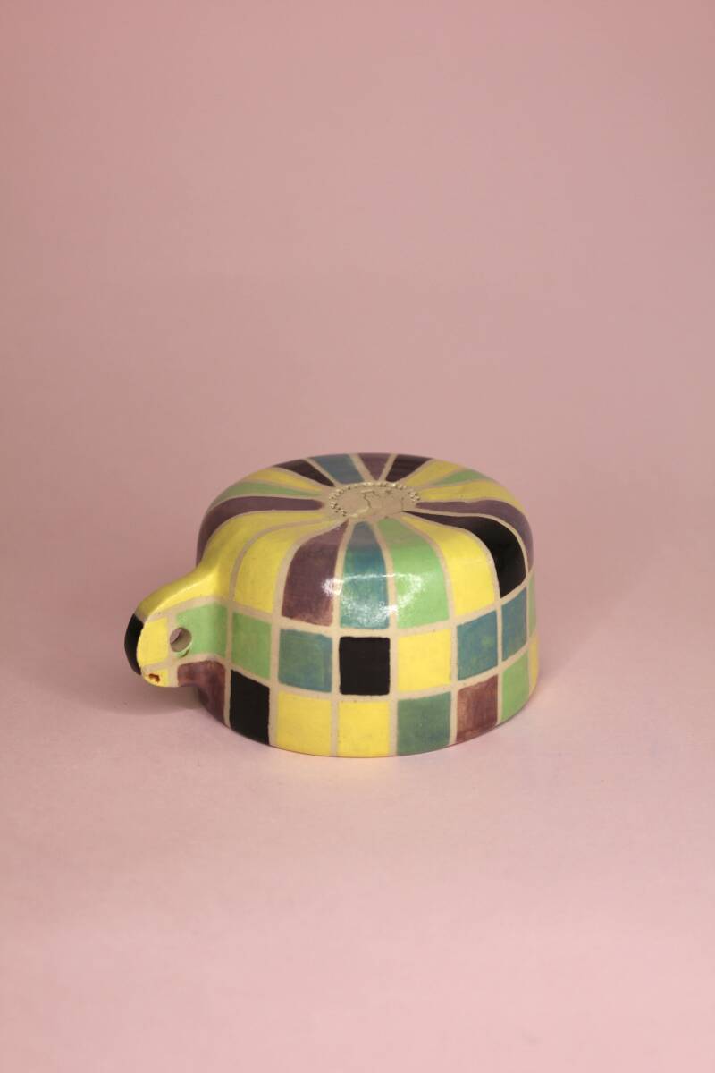 handgedraaid steengoed mokje. gemaakt van witte klei. gedecoreerd met verschillende kleuren onderglazuur in blokjespatroon. afgewerkt met glanzend transparant glazuur aan binnen- en buitenkant.