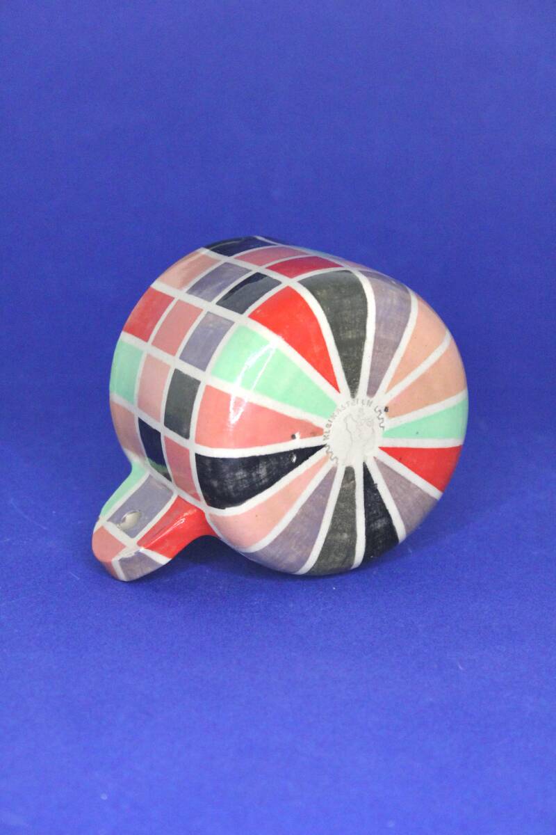 handgedraaid steengoed mokje. gemaakt van witte klei. gedecoreerd met verschillende kleuren onderglazuur in blokjespatroon. afgewerkt met glanzend transparant glazuur aan binnen- en buitenkant.