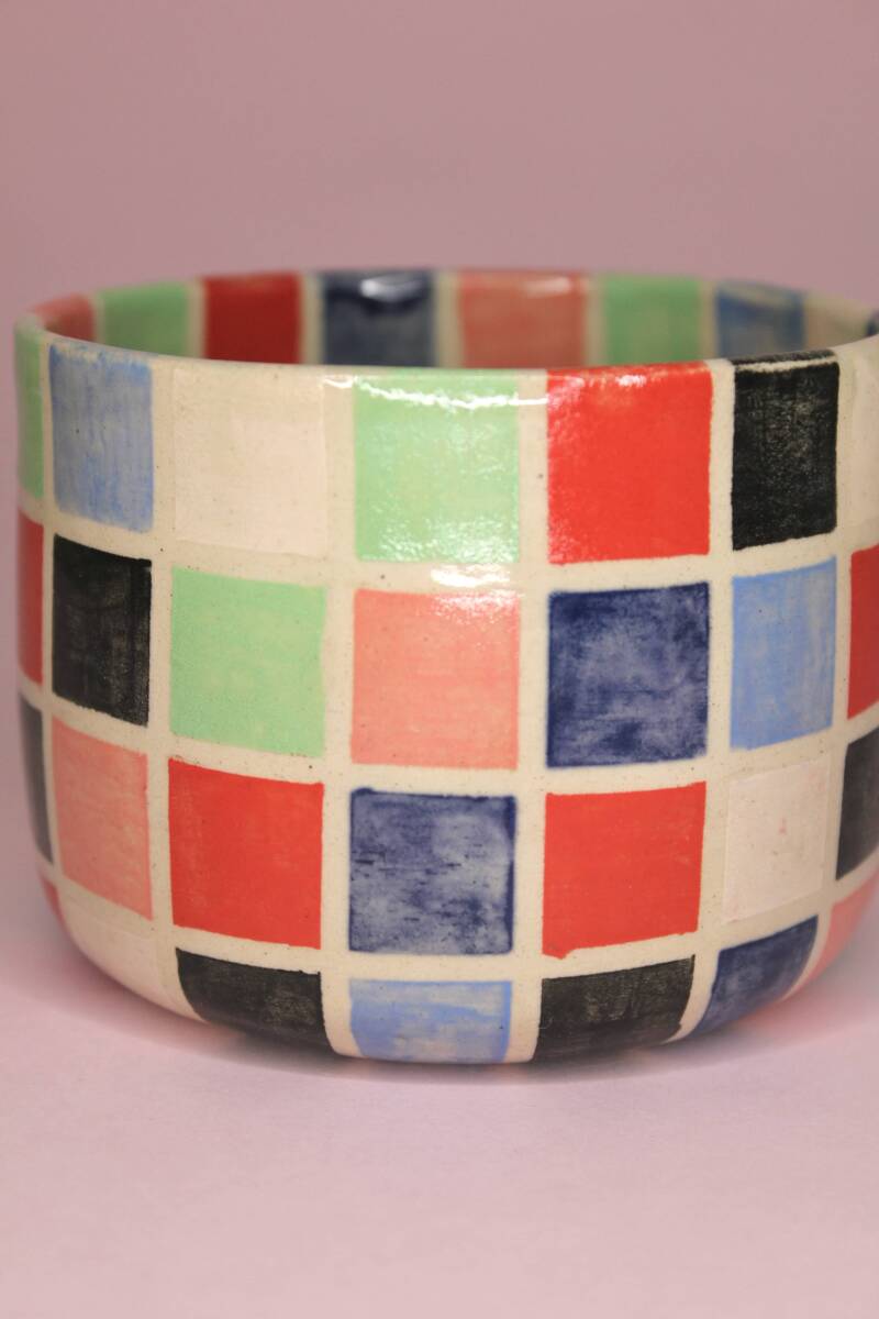 handgedraaid steengoed mokje. gemaakt van witte klei. gedecoreerd met verschillende kleuren onderglazuur in blokjespatroon. afgewerkt met glanzend transparant glazuur aan binnen- en buitenkant.