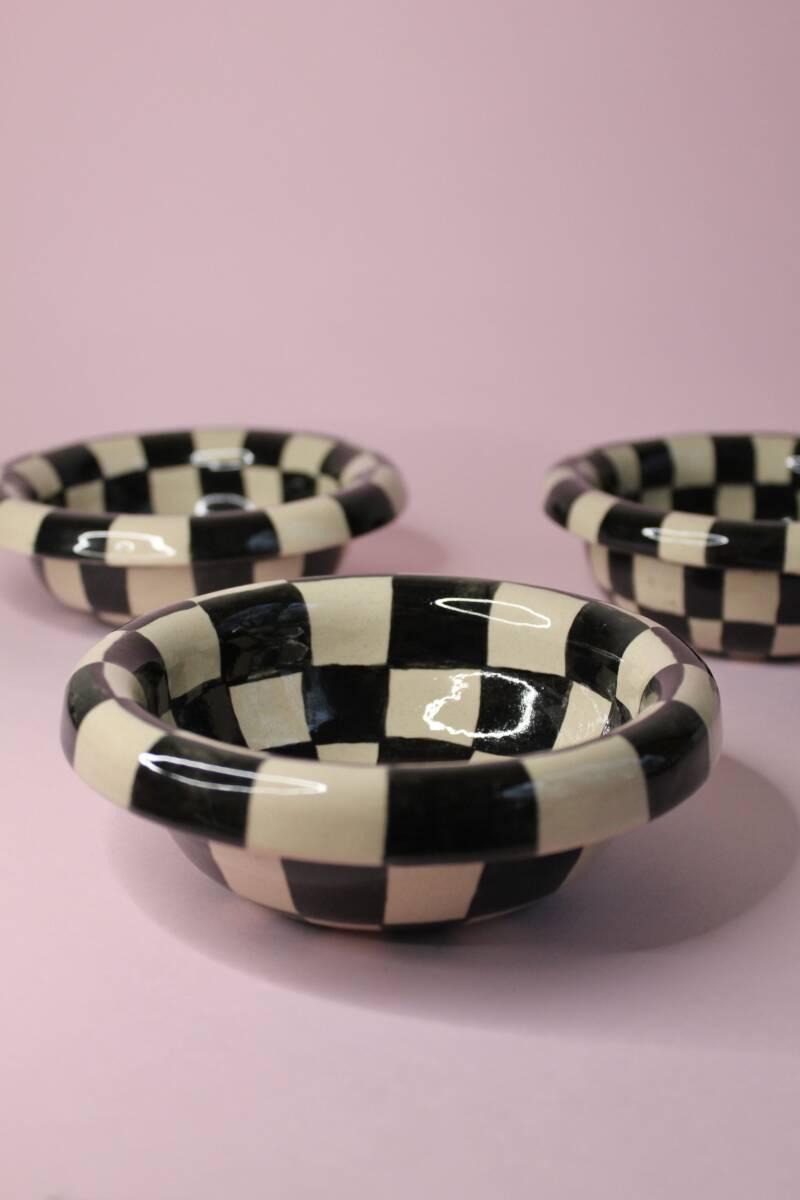handgedraaid steengoed kommetje met omgeslagen rand. gemaakt van witte klei. gedecoreerd met zwarte blokjes, waarna geglazuurd met transparant, glanzend glazuur.