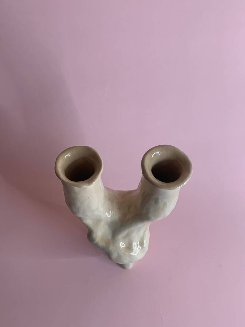 handgevormde steengoed kandelaar. gemaakt van witte klei. gebroken wit glazuur aan binnen- en buitenkant.