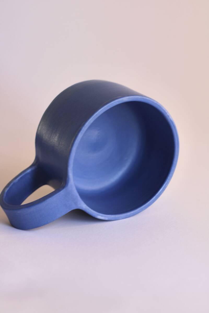 handgedraaid steengoed kopje met breed, plat oor. gemaakt van witte klei. geglazuurd met blauw onderglazuur met daar overheen mat transparant glazuur.